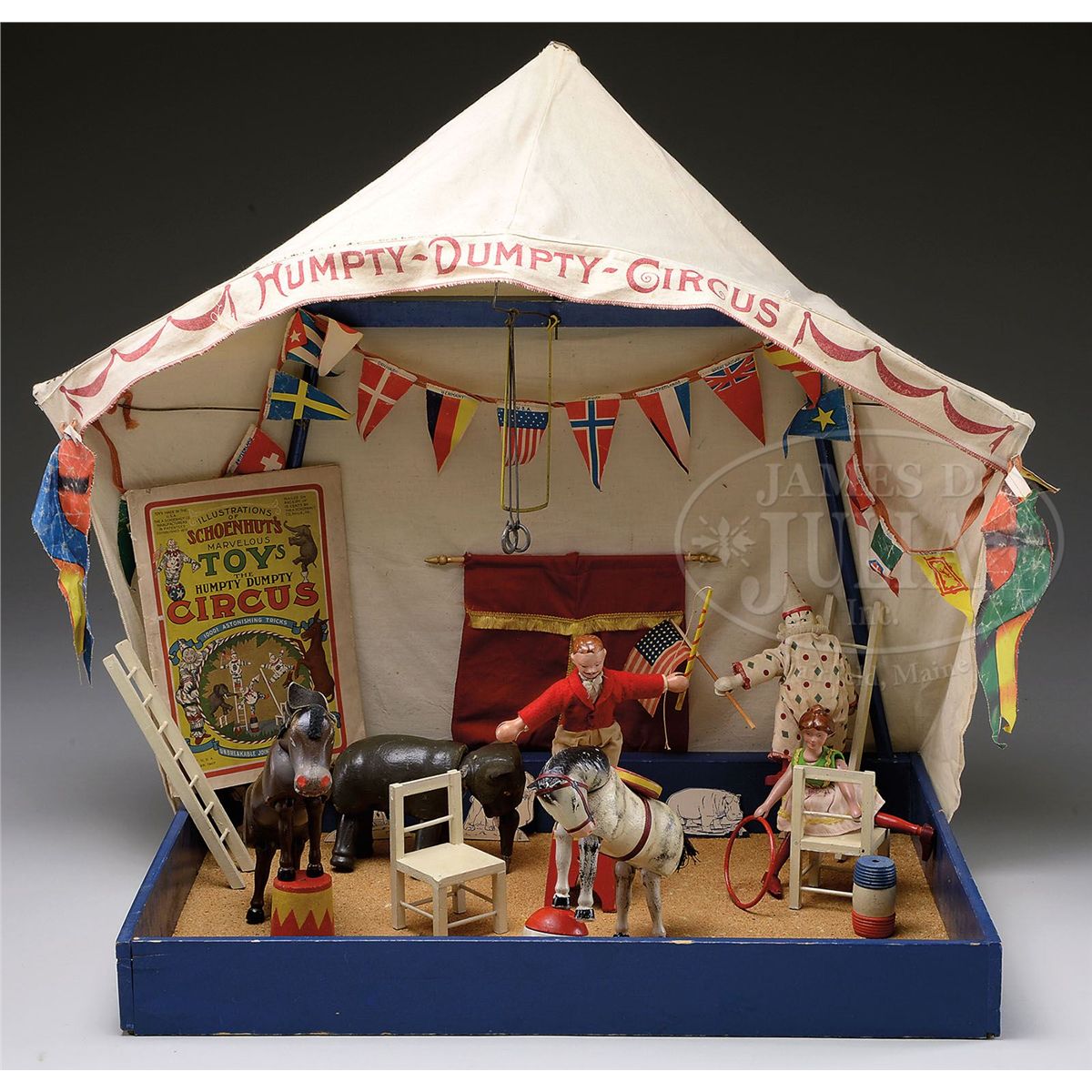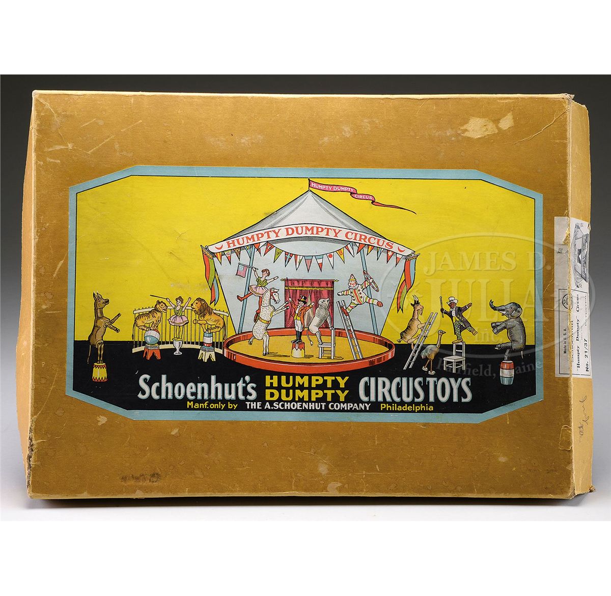 A really wonderful example of a Schoenhut toy featuring a self contained rent with ring and trapeze. Included in this grouping is the ring master, a clown, bare back rider, dapple horse with platform, elephant and donkey. Accessories included are chairs, ladders, pedestals, ball, whips and a hoop. Original partial color catalog circa 1918 included. SIZE: 24" l x 18" w x 3" h. (Box size) CONDITION: Overall very fine plus. Box label shows picture of contents and a wonderful large color label on top of box. Adds to the allure. Animals would benefit from restringing. 1-13344