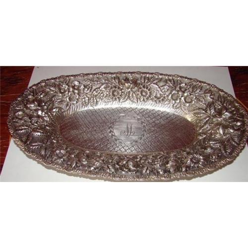 1900'S Sterling Silver Repousee Schofield Baltimore Rose Rare Bread Tray. This is one of three well known Baltimore Silversmiths from the 20th Century. The others being Stieff and Kirk that made this wonderful rose repousee pattern in sterling silver flatware and serving pieces such as tea sets, bowls,trays,wine tankards, etc. This bread tray is one of two Schofield Bread Trays that we just acquired out of a Baltimore Estate. Fresh to the market, this bread tray has a wonderful deep repousee pattern of roses that goes all the way around the side of this fine serving piece. There is a checkered pattern on the bottom of the dish with a M as the monogram. It measures 10 5/8" X 6" In width and the weight is 8.2ozs. We can email additional images of the Schofield mark and also the original retailer which was S & N KATZ Jewelry Store which was in business for over 100 years in the City of Baltimore on Fayette Street in Downtown Baltimore.