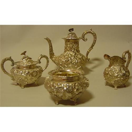 A Very Fine and Rare Baltimore Schofield Baltimore Rose 4-piece Coffee/Tea Set, Circa 1930. The Coffee/Teapot has a baluster form body with a nicely decorated all over repousee decoration. The sugar bowl with cover, creamer and waste bowl are all decorated in the same manner. All four of these pieces are marked identically and came out of the same set. We feel the pot is a coffee pot and actually if we had the teapot we would have a $20,000 set in this wonderful and extremely rare pattern. Each of these pieces are marked Schofield. Baltimore Rose. 2500. Sterling--Fine. Also marked with the asseyers mark identifying it as schofield. Each and Every one of these pieces are in EXCELLENT CONDITION. DIMENSIONS: Coffee Pot height is 10", Width is 11" from handle to spout at widest point. Sugar Bowl is 4" to the rim and 6" to the top of the floral finial(the baltimore rose). Handle to Handle on sugar is 8". The creamer height is 5 1/4" to top of spout at highest point and 6" to top of handle. It also measures 5 1/2" from spout to handle. The open waste bowl is 4" in height and the top opening measures
