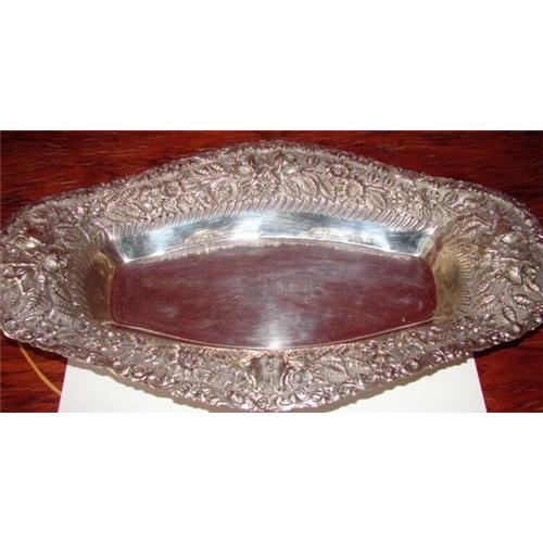 1900'S Sterling Silver Repousee Schofield Baltimore Rose HUGE Rare Bread Tray. This is one of three well known Baltimore Silversmiths from the 20th Century. The others being Stieff and Kirk that made this wonderful rose repousee pattern in sterling silver flatware and serving pieces such as tea sets, bowls,trays,wine tankards, etc. This bread tray is one of two Schofield Bread Trays that we just acquired out of a Baltimore Estate. Fresh to the market, this bread tray,which is larger than the other one has a wonderful deep repousee pattern of roses that goes all the way around the side of this fine serving piece. It has a plain inside sterling bottom of the dish with a S H R as the monogram. It measures 15 1/2" X 9" In width and is over 1 1/2" in Depth. We can email additional images of the Schofield mark which is on one end of the bottom and a #1484 on the other end.