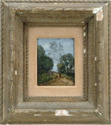SCHOOL OF COROT (French, 19th Century) FIGURE ON PATH. Oil on wood panel shows figure walking up dirt path between trees under blue sky. Signed center bottom ""Corot"". Housed in an antique gesso decorated frame with some gesso loss. SIZE: 5-1/2in. x 4-1/4in.. CONDITION: Some inpainting, very good. 9-26494