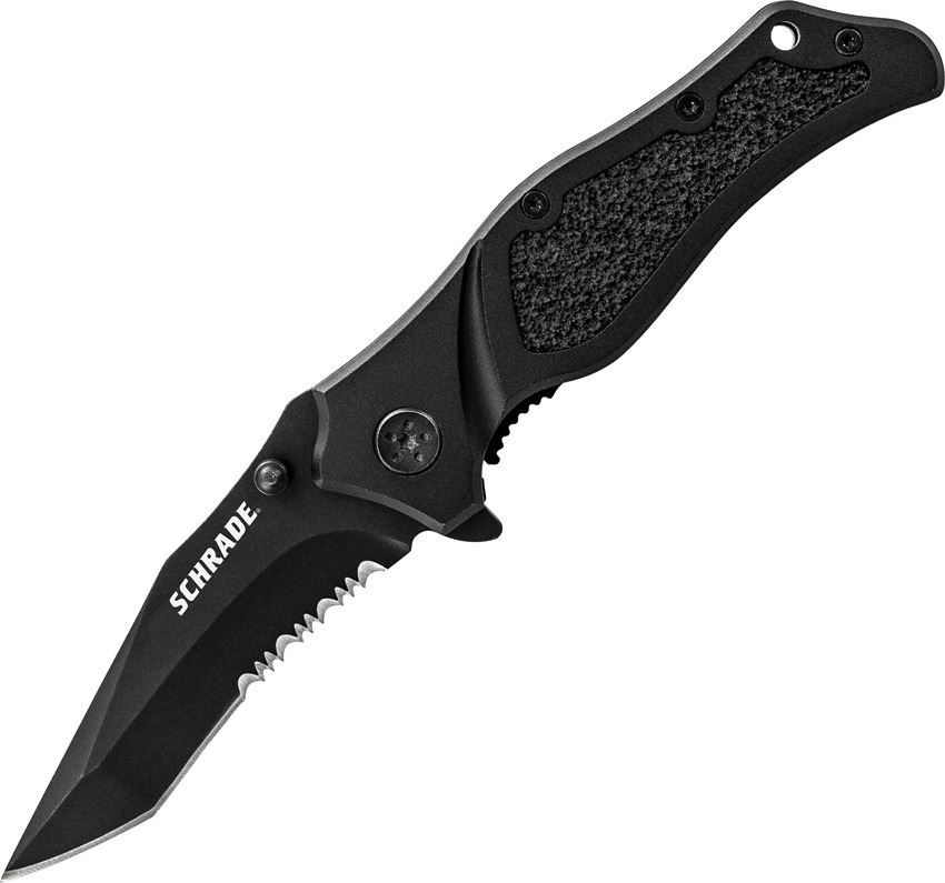 4 1/8" closed. 3" black coated partially serrated 9Cr14MoV stainless recurve tanto blade with dual thumb studs and extended tang. Black aluminum handles with Track Tech grip inserts. Lanyard slot. Black stainless pocket clip.