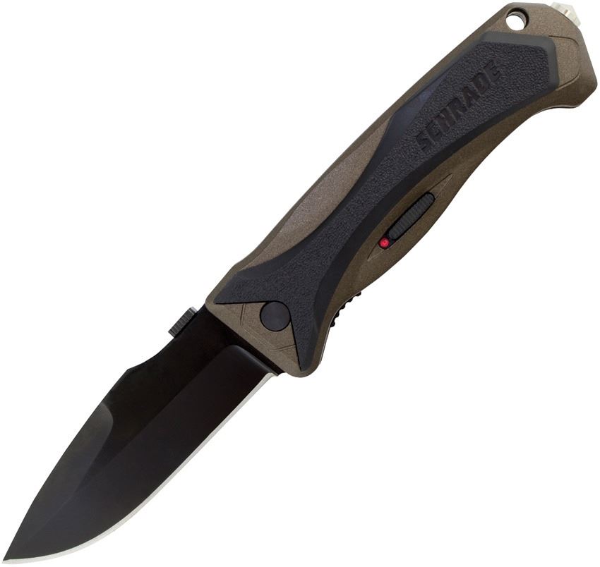 Assisted opening. 4.88" closed. 3.63" black finish AUS-8 stainless drop point blade. Bronze aluminum handle. Thumb stud. Extended tang. Glass breaker. Lanyard hole. Pocket clip. Black rubberized handle insert. Side safety lock
