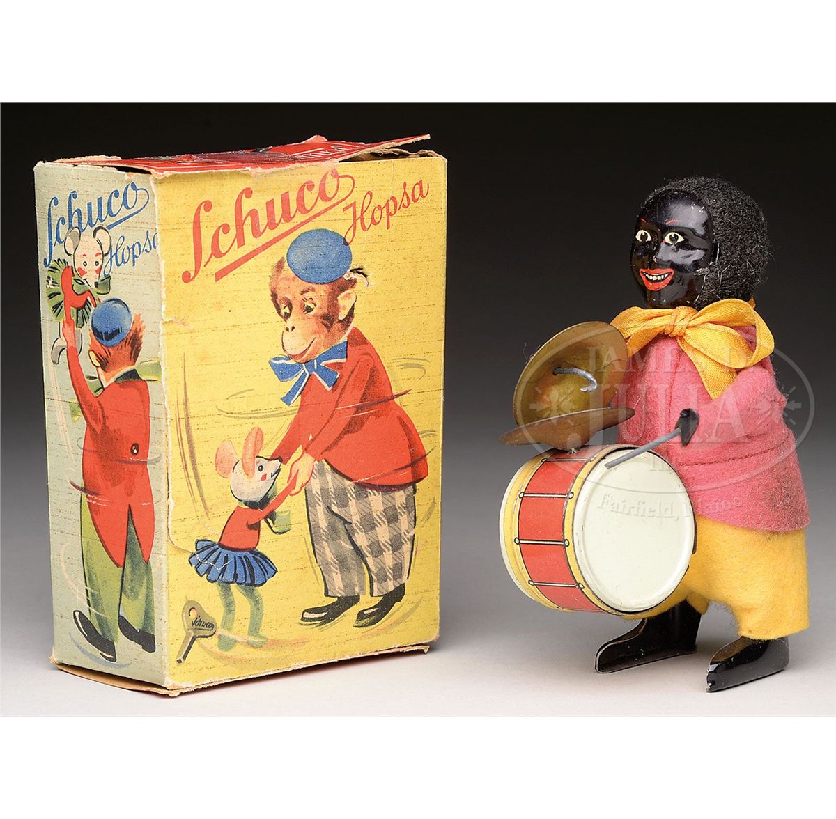 Highly sought after Schuco windup figure plays cymbals and beats drum - all while body vibrates in circular motion. Body is tin with felt cloth clothing and hair. Face is lithographed tin showing exaggerated black features. Box has one end flap detached though present. U.S. Zone Germany. SIZE: 4-1/2" t. CONDITION: Near excellent. All functions working. 1-13280