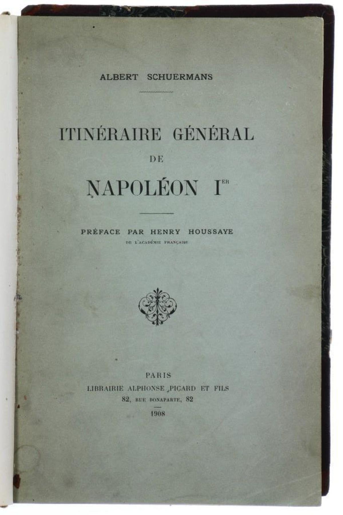 Schuermans, Albert. Itineraire general Napoleon 1er. Paris: Alphonse Picard, 1908. Half pebbled calf. Limited edition number 361 of 500. Original wrappers bound in. Boards detached, chipping to spine, soiling to rear.