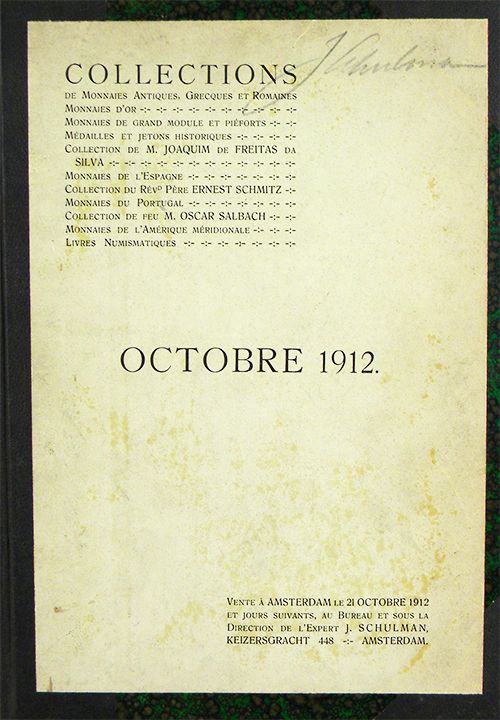 Schulman, J. CATALOGUE DES RICHES COLLECTIONS DE MONNAIES ANTIQUES... Amsterdam, 21 octobre 1912 et jours suivants. Small 4to, contemporary black cloth and boards; original printed card cover mounted on front. (4), 116 pages; 2335 lots; 16 plates. Interleaved throughout; a few lot descriptions clipped from the text. Very good. The Schulman firm's account sales copy with columns on the interleaves for lot numbers, what appear to be reserves, and the selling prices, with running totals up to lot 1462 (total of reserves: 10030.95 - total of lots sold: 16610.75).
