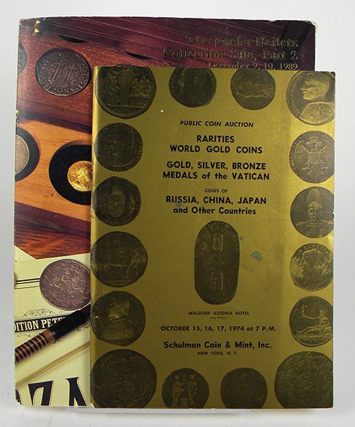 Schulman Coin & Mint. THE TRAFALGAR, AUSTRIAN AND PENNSYLVANIA COLLECTIONS. New York, Oct. 15-17, 1974. 8vo, original pictorial card covers. 103, (1) pages; 1299 lots; illustrated. Near fine. [with] Superior Galleries. THE JASCHA HEIFETZ COLLECTION SALE, PART 2. New York, Dec. 9-10, 1989. 4to, original pictorial card covers. (20), 316, (2) pages; 3438 lots; text illustrations; 4 color halftone plates. PRL. First leaf loose; very good. Two sales featuring select Russian coins among their offerings.