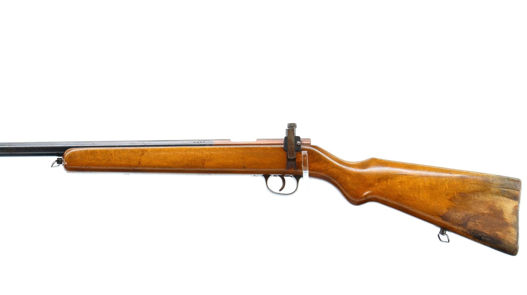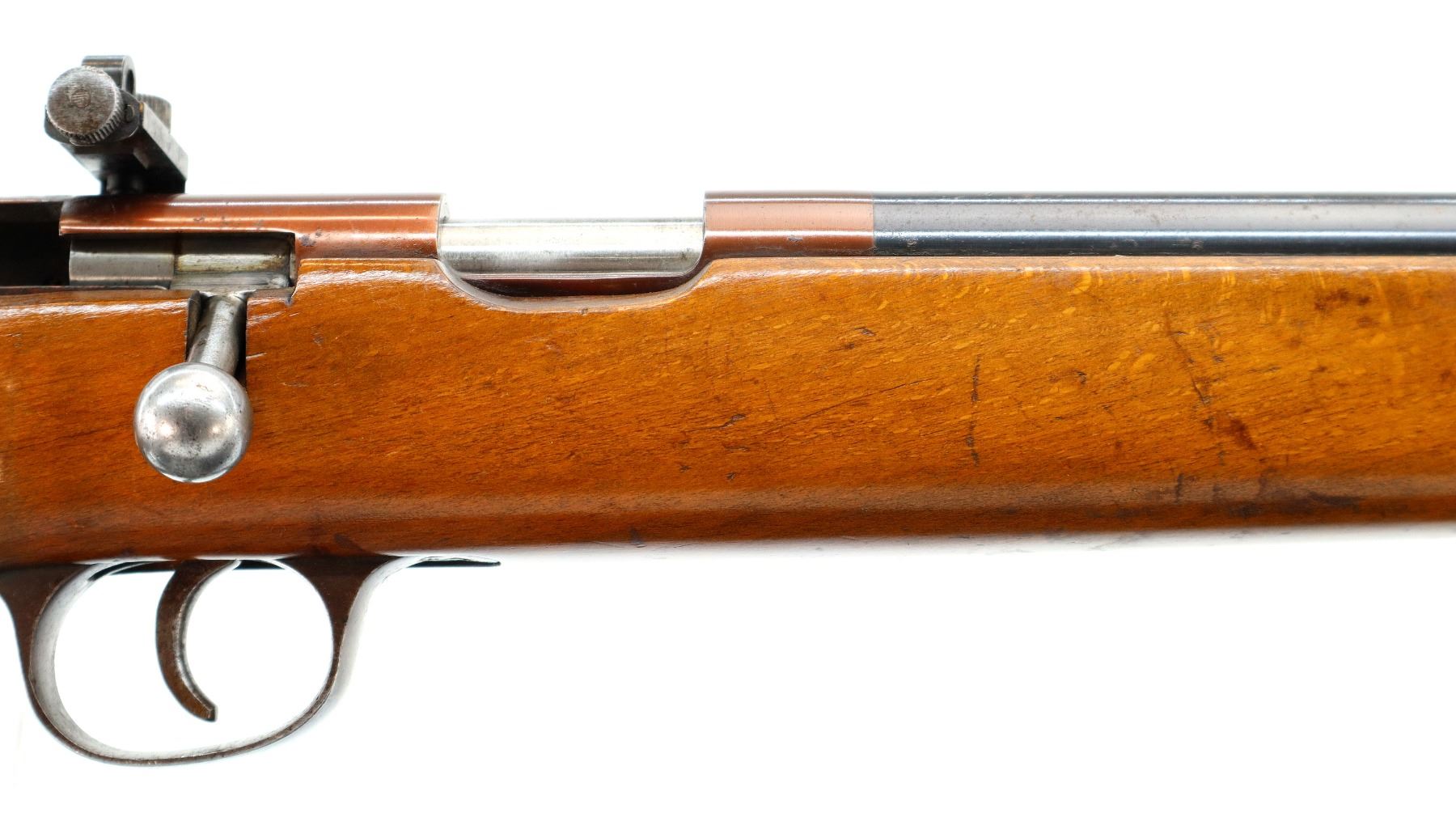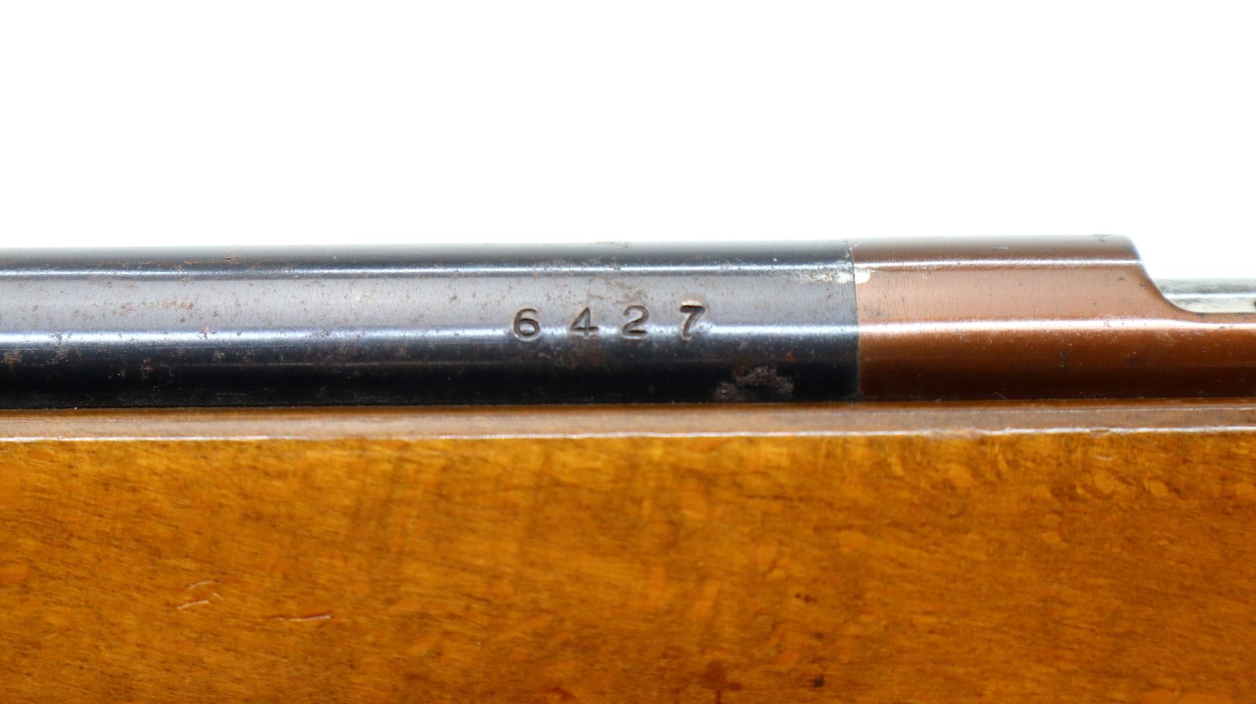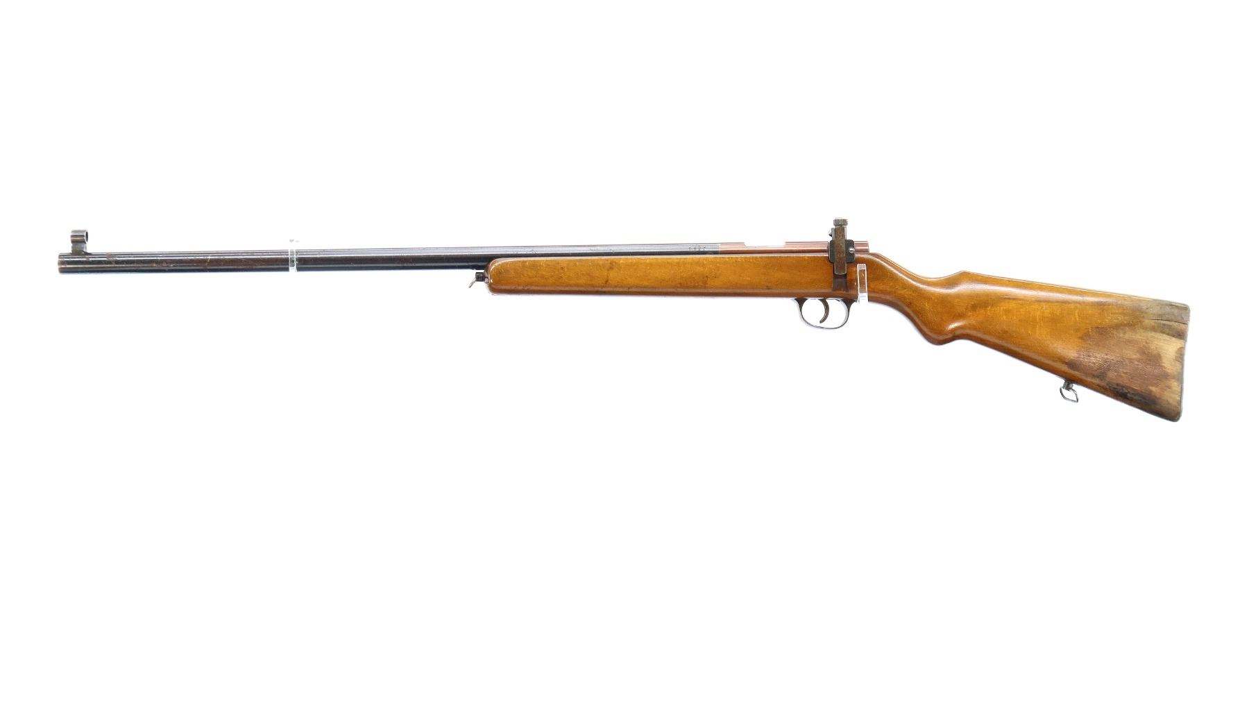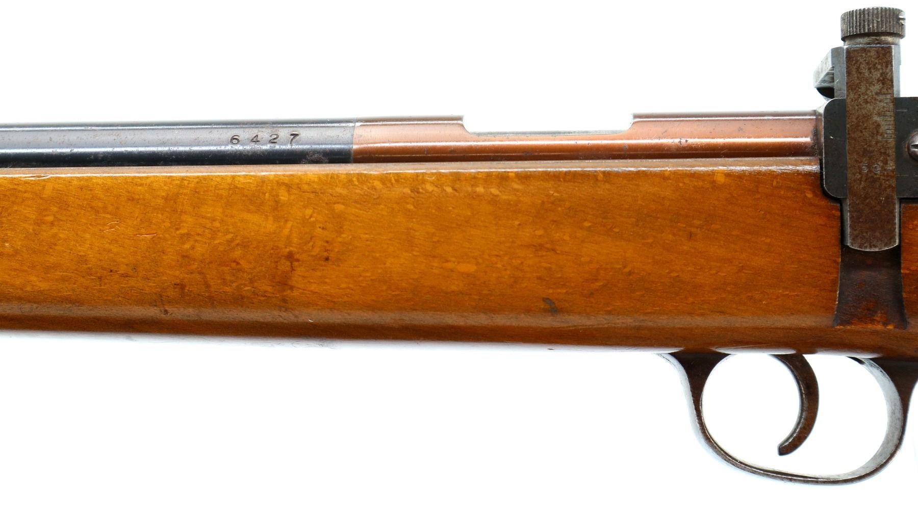Main Description: Globe front sight with insert, adjustable rear peep sight missing eye cup, blued heavy barrel, receiver is plum coloured, silver bolt with straight handle and smooth knob, extractor is present. One piece wood stock, pistol grip, smooth steel butt plate which is pitted and rusty, stock cracked at heel, sling swivels.