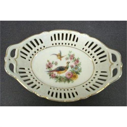 BEAUTIFUL OPEN HANDLE SMALL SERVING DISH, MADE BY SCHUMANN - BAVARIA , IT IS DECORATED DEPICTING GORGEOUS PIERCED LOOK, BIRDS AND FLORAL PATTERN - as per images - Excellent condition - Measures about 6 3/4" X 4 1/2", US Buyer to pay 7.00 for shipping plus insurance.THANKS.