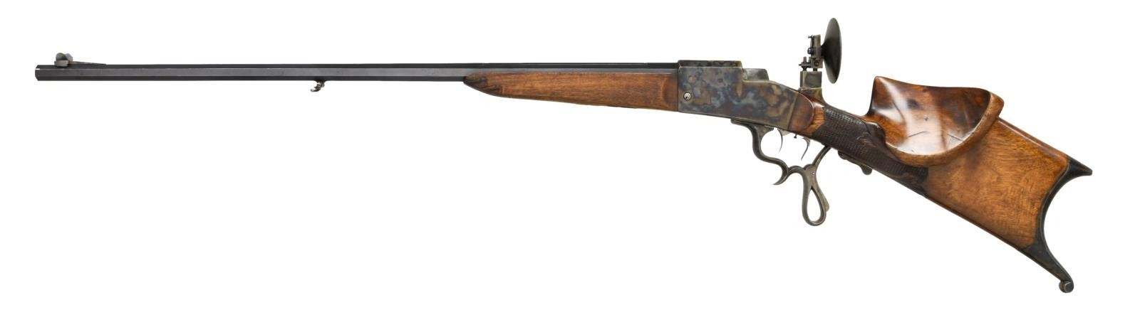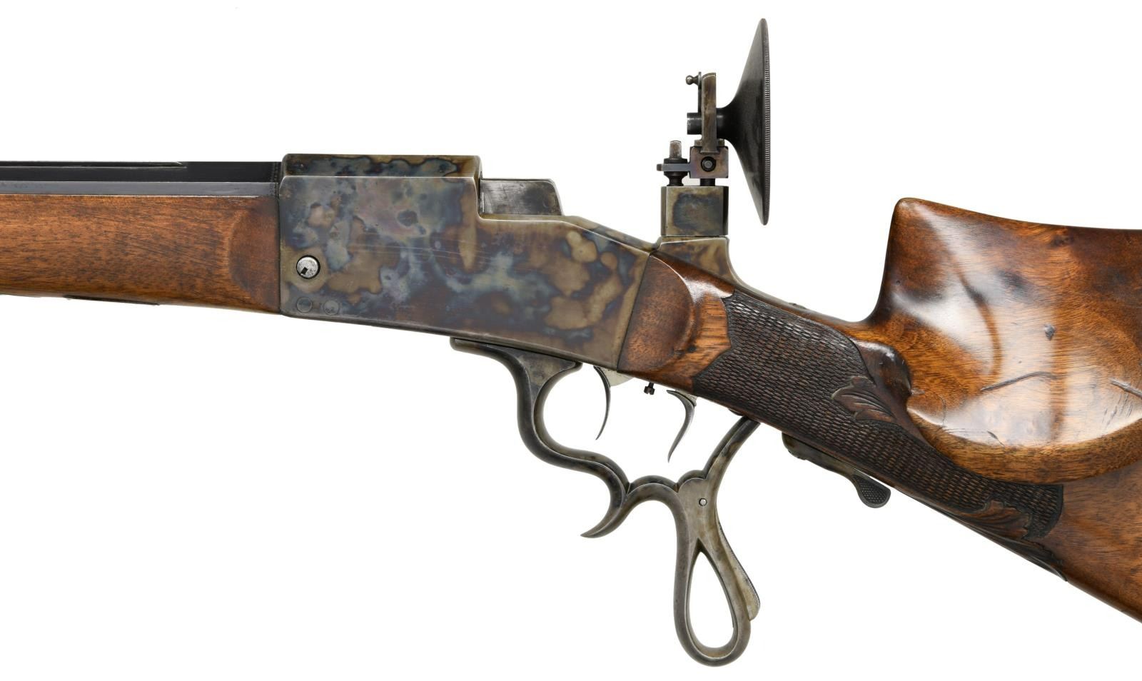 Cal. 8.15/46R. NSN. The 32 3/8" octagon barrel has matted top flat with broad dovetail portion at rear engraved "SIMON HEIM NURNBERG". Case hardened dropping block action with removable trigger/firing group is marked "D.R.G.M." on top. Rifle is fitted with double set triggers and original aperture rear sight adjustable for windage and elevation with large disk. Walnut buttstock with case hardened hook butt and high Schutzen cheekpiece has thumb rest on right side. Checkering at grip is accented by acanthus carving. Matching forend screws to barrel and a silver rectangle is tacked to the bottom which is engraved "Alvis Petrak" "ROTHENBACH/PEG". CONDITION: very fine. Metal retaining over 90% of what appears to be original factory finishes. Stocks have oil rubbed into their original finish over some light marks. Some chipping is evident at rear along edge of buttplate, most noticeable on right side. Bore is bright and shiny. Mechanically good. PROVENANCE: From the Harold Prucha Collection. (23-5087/MGM). CURIO. $2,000-2,800.