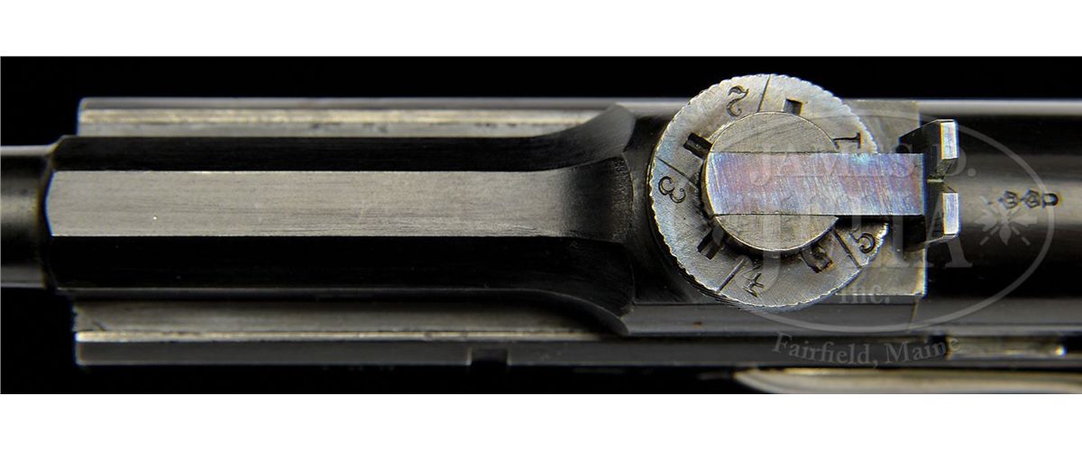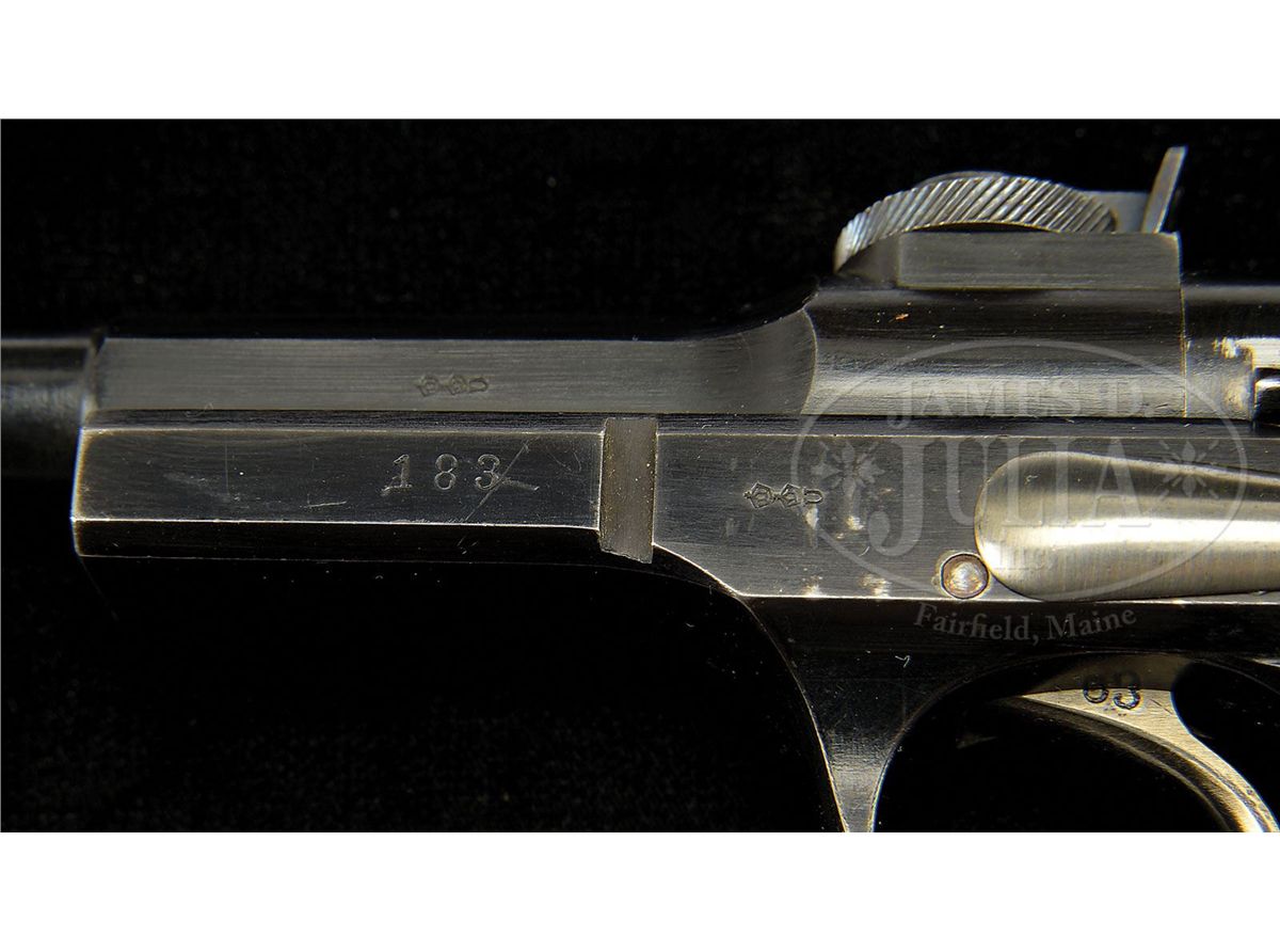 SN 183. Cal. 7.63mm. Despite their antique status, Schwartzlose pistols have the look of a modern gun. Many were reportedly shipped to Russia or were used hard and put away wet. Only a handful remain in their pristine, original form, and most of those tend to change hands quietly. This pistol has a 6.5" bbl with a fixed front sight and a vertically adjustable rear sight whose elevation is adjusted using a serrated cammed wheel. The rear of the barrel is Crown/Crown/U proof marked, which is repeated on the left side of the frame and on the upper bolt housing, just behind the rear sight. The SN 183 is marked on the left side of the frame and repeated on the back of the bolt, on the back of the firing pin (83) and on the bottom of the magazine. The bbl, bolt, frame and magazine are blued. The rear sight and elevating wheel are fire blued, while the trigger, slide release, takedown lever, firing pin and magazine release are brightly polished and left in-the-white. Grips are heavily varnished and deeply cut with fine, carefully bordered checkering. The gun is presented in a nicely appointed wood case, lined in dark green velvet, trimmed with green and black cord, and close fitted for the pistol, and compartmentalized for a cleaning rod and a box of ammunition. Closure is effected by a singled keyed latch located under a carry handle. PROVENANCE: Dr. Geoffrey Sturgess Collection, ex-Visser Collection. CONDITION: Schwartzloses are finished with a different, blacker "blue" than most pistols; similar to the Black Army M1911s but with a better polish. When untouched, the finish is so dark it almost looks like black paint. This gun is one of the few whose finish still has that hue. There is some minimal sharp edge wear, wear to the left side of the bolt where it rubs against the frame when retracted, and some minor spotting of the right side of the frame and backstrap. In all, the gun retains at least 98% of its original bright very dark blue. The same stunning condition applies to all the small parts and the grips that retain virtually all their original varnish and all the crisp checkering. There is slightly more wear to the magazine from having been run in and out of the pistol. Perfect bore and perfect mechanics. Excellent condition wood case that protects and highlights the gun. If you want to have the best Schwartzlose in existence, this is your pistol! 4-52231 LMA112