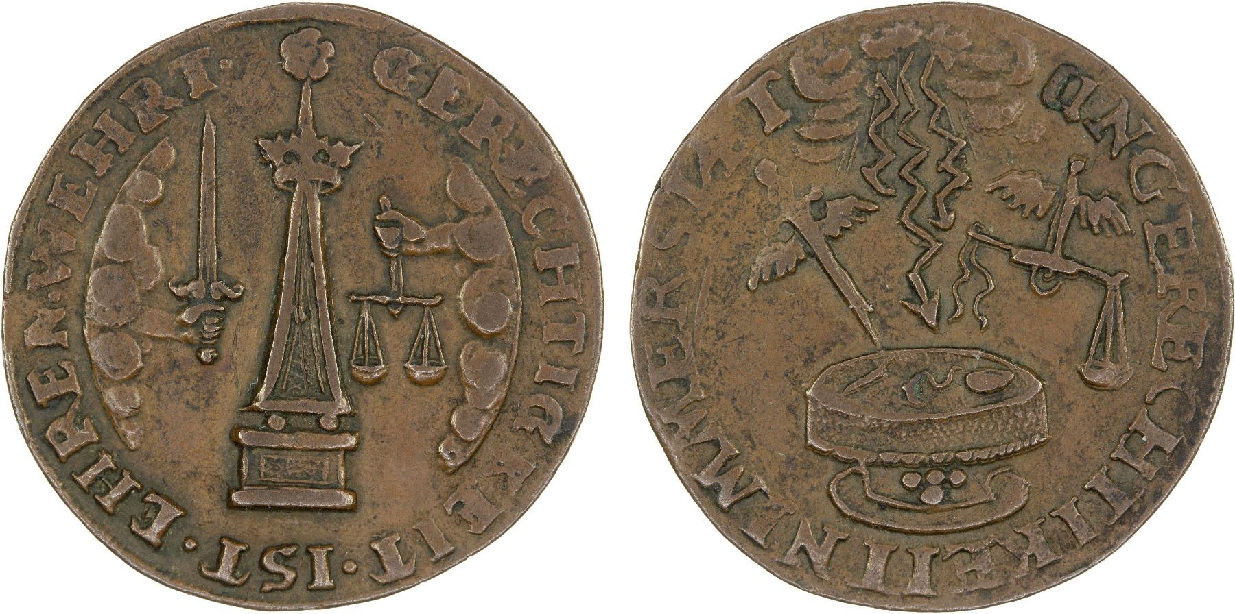 SCHWARZBURG-RUDOLSTADT: AE rechenpfennig (3.22g), ND, Neumann-32964, 23mm bronze jeton stuck in the 17th century; GERECHTIGKEIT IST EHRE WEHRT aropund obelisk; to either side, hand emerging from cloud holding sword and scales, respectively // UNGERECHTIGKEIT NIMMER STAET, lightning striking table; above, winged sword and winged scales, a lovely example of this scarce token, VF.