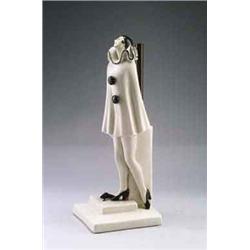 SCHWARZBURGER WERKSTÄTTEN, Werk Passau Roland Paris Tischleuchte, Porzellan, Metall. Auf einem getreppten, quadratischen Sockel eine Pierette, zu ihren Füßen ihre Maske. Sie steht an die pfeilerartige Porzellanfassung für den Metallschaft der Leuchte geschmiegt. H.: 36 cm. Bez.: Firmenmarke, Mod.Nr. 430. Um 1920 Lit.: Schwarzburger Werkstätten für Porzellankunst, Wilhelm Siemen (Hrsg.), Wunsiedel 1993, Abb. 163, S. 175 (zum Vergleich).