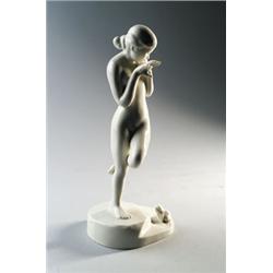 Porzellan, weiß. Auf ovaler Plinthe steht ein Mädchen mit angewinkeltem Bein und schützend vor die Brust gelegten Armen auf einem Felsen, vor dem sich ein Frosch befindet. H.: 26 cm. Bez.: Firmenmarke (unterglasurblauer Stempel) mit Schleifstrich und Blindstempel, Mod.Nr. U308 (geritzt), Künstlersign. auf der Sockelrückseite HM. 1920