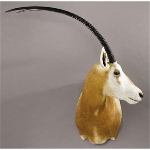 <B>SCIMITAR HORNED ORYX SHOULDER MOUNT</B></I><BR> <I>Oryx dammah</B></I><BR>A beautiful animal with long scimitar-shaped horns, these oryx are no longer hunted in their native country of Chad. A semi-desert grazer, it is gregarious and mixes well with other herd animals. They have now been introduced onto Exotic Game ranches here in Texas and a few other places, and are doing well. The present mount exhibits superior workmanship and has good-sized horns for a mature bull, measuring 35 x 34 5/8 inches long with bases 6 x 5 7/8inches around. The mount stands out from the wall to the nose-tip 21 inches, 38 inches high and 36 inches wide. <BR><BR><b>Shipping:</b> Requires 3rd Party Shipping (<a target="_blank" href="http://www.heritageauctions.com/common/shipping.php">view shipping information</a>)