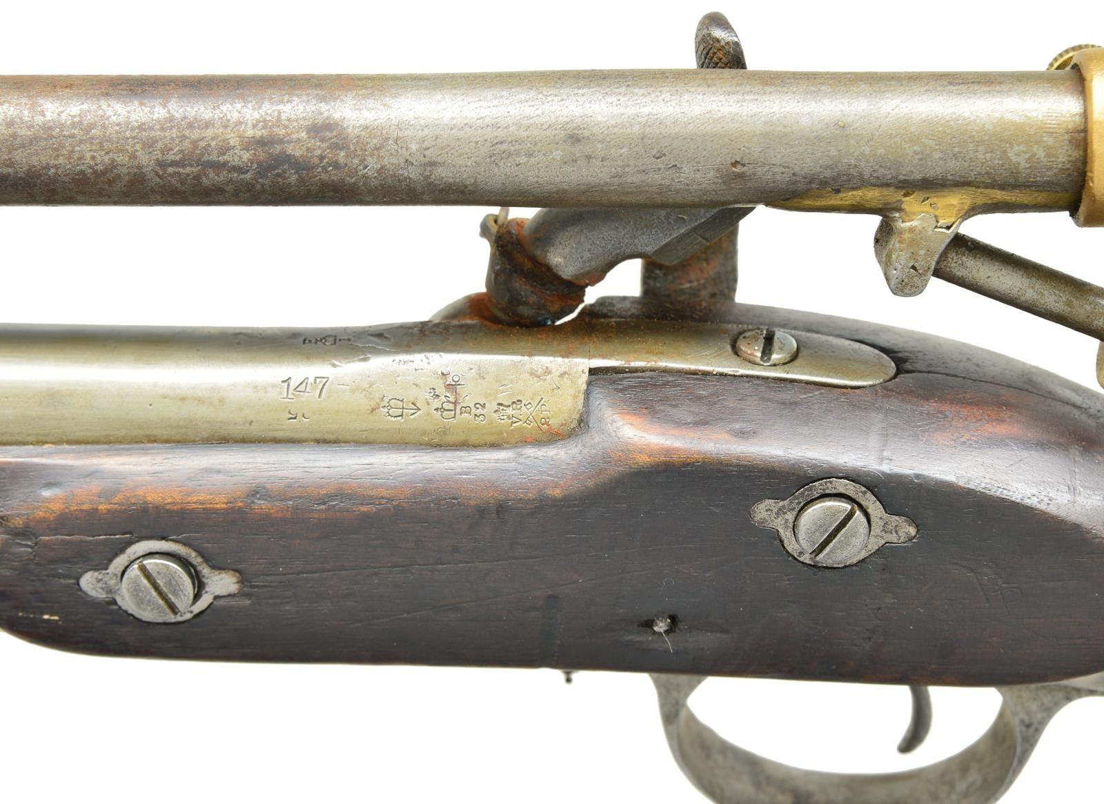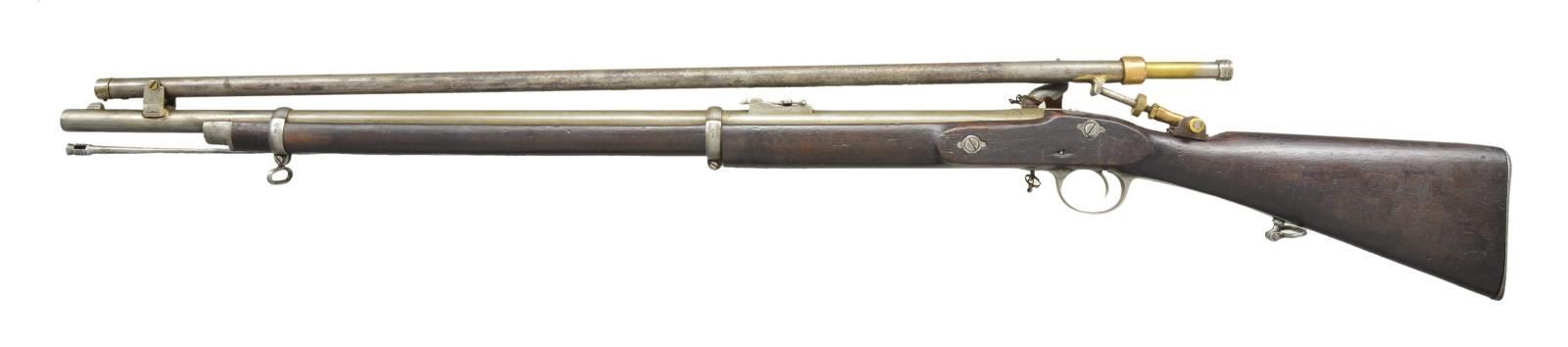 RIFLE. Cal. 577. NSN. 49” Overall with a 33” standard configuration, iron mounted, round barrel with British army “broad arrow” and other proofs at breech, standard long range Enfield ladder sight in addition to 29” 3/4" diameter sighting tube with cross hairs, no lenses, tiny peep hole at ocular end, windage & elevation adjustments mounted on wrist. Lock has “VR” cypher & crown & “1860 / ENFIELD” and broad arrow proofed. Stock has storekeeper marks and broad arrow proof along with spurious “JS/(anchor)” stamped forward of trigger guard. CONDITION: good overall, complete, and original included “broad arrow” proofed bent ramrod with threading removed and both sling swivels. The “scope” was later addition, the hammer was altered “bent out” as to be able to be cocked free of tube; tube was bent in so spur could strike nipple freely. Markings in metal are good, stock markings worn and only partially discernible. Mechanically functionable, pitted dirty rifled bore. (01-21528/JS) ANTIQUE. $1,000-1,500.
