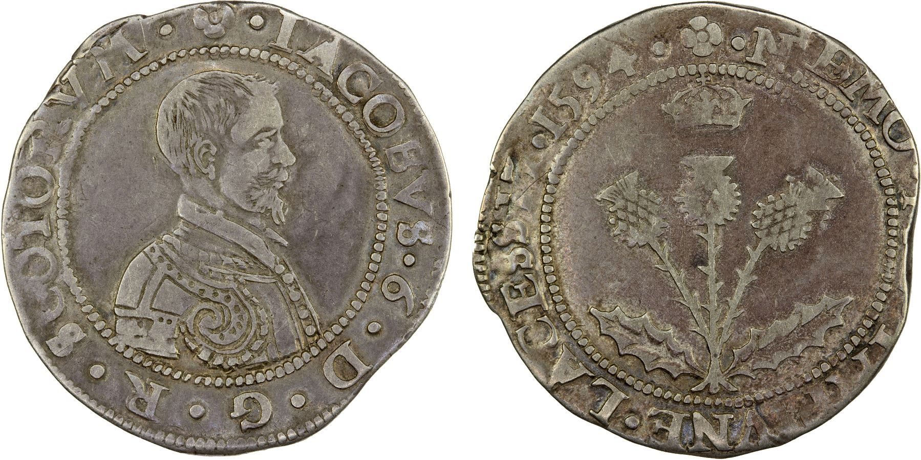 SCOTLAND: James VI, 1567-1625, AR 10 shillings (6.09g), 1594, KM-A5, Spink-5493, seventh coinage, bare-headed bust in armor right // crown above thistle, removed from an NGC holder graded VF 35, certification Number 6268036-002, VF, ex Dr. Robert A. Rosenfeld Collection, ex Sovereign Rarities Ltd New York Sale 55, Lot 1410, ex CNG 61, 9/2002, Lot 2682, ex Peter Corcoran Collection.