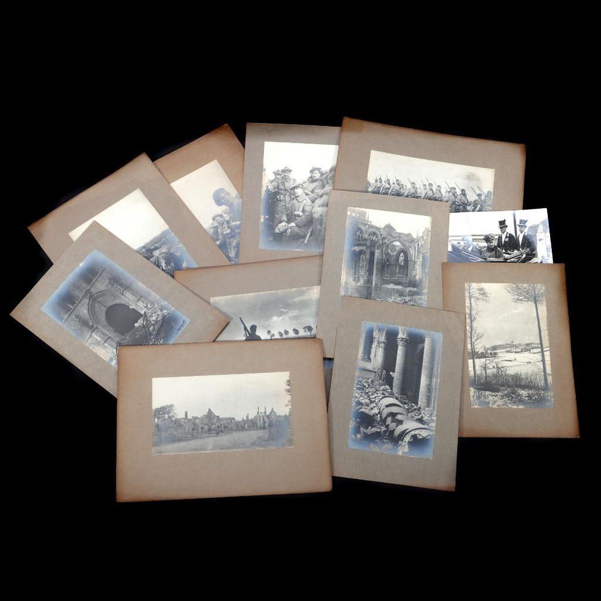 A collection of twelve original photographs mounted on cards, several with handwritten captions on back, and dated 1915; showing Scots Guards Royal Regiment soldiers and other scenes in France. Images consist of bombed structures, including Ypres Cathedral (5); trench scenes (3); battlefield/landscape scenes (2); marching (1); and camp scene (1). Photos ranging from 5 1/2in. x 3 7/8in. to 6in. x 3 7/8in. Condition: Generally good, with some fading and surface scratching, darkening/toning at edges. Together with: Three 6 1/4in. x 8 3/8in. news agency photographs of King George V at the dedication of a war memorial at Aberdeen, and inspecting the Guards, September 29, 1925. With blindstamp copyright mark for "The Bulletin" lower right. Condition: Two are good; one with corner crease and 1 1/2in. tear.
