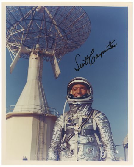 (b. 1925) American astronaut, America's second man in space. Fine S.P. 8" x 10" color, a great standing shot of Carpenter in space suit. Boldly signed at top right in black marker and in very fine condition.