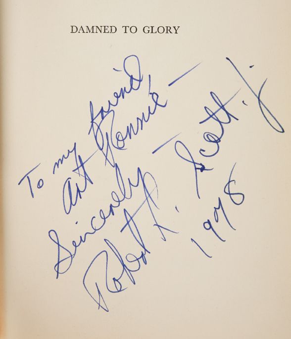 New York, Charles Scribner’s Sons, 1944. First Edition, first printing. Octavo (7 7/8 X 5 5/8 in., 200 X 143 mm). 228 pages. Red cloth, spine and front board lettered in black. Very Good. Hinges are sound. Ownership name in ink on the front endpaper. Priced dust jacket is creased at the panel edges, with paper tape reinforcement of the folds on the verso. Signed by Robert L. Scott on the half-title page, “To my friend, Art Ronnie – Sincerely, Robert L. Scott, Jr., 1978.”