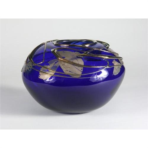 ART GLASS: Scott and Laura Curry, large cobalt vase of bulbous form with applied gold-tone decorations. 9'' high