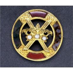 SCOTTISH 18K YELLOW GOLD CIRCULAR BROOCH, centering a raised insignia set with 3 half pearls, within a circular border of engraved decoration and 4 carved hardstone panels, 13.6 grams