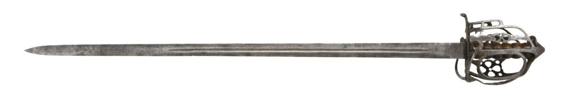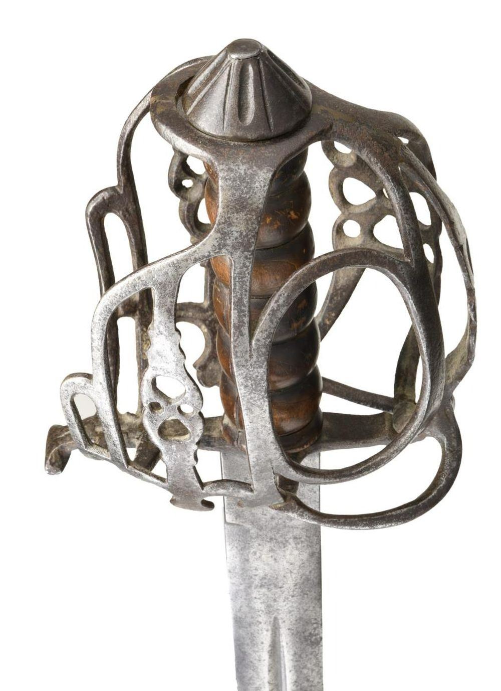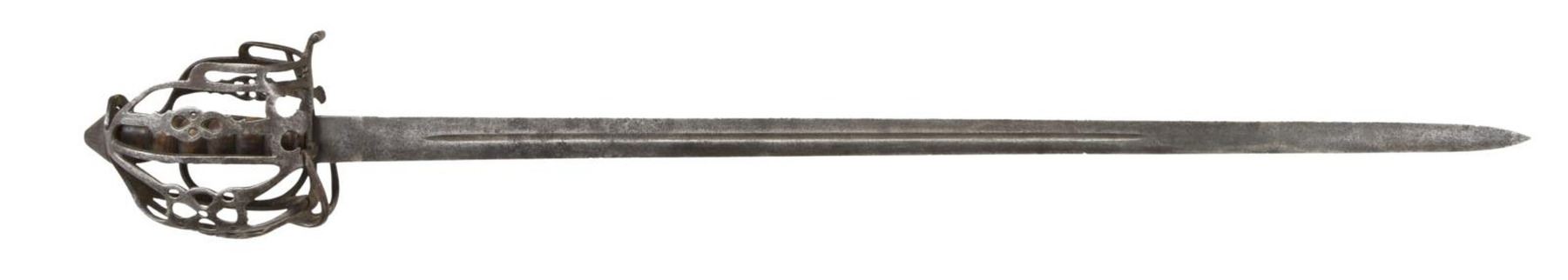 Overall length: 39”. Blade length: 33”. This broadsword likely dates to the end of the 18th century or the early 19th century. Plain blade with a small central fuller measuring about 19”. Iron basket hilt with 9 vertical branches, including 4 with heart-like & circular cutouts. Drop quillon of extended cylindrical form with a conical pommel. 6-Lobed wood grip is possibly a later repair. No scabbard. CONDITION: blade has a medium gray patina with scattered light pitting. The entire hilt also has a medium gray patina with scattered pitting. The wood grip does show some age cracks & wear to the finish. (02-20050/BF). $1,000-1,400.
