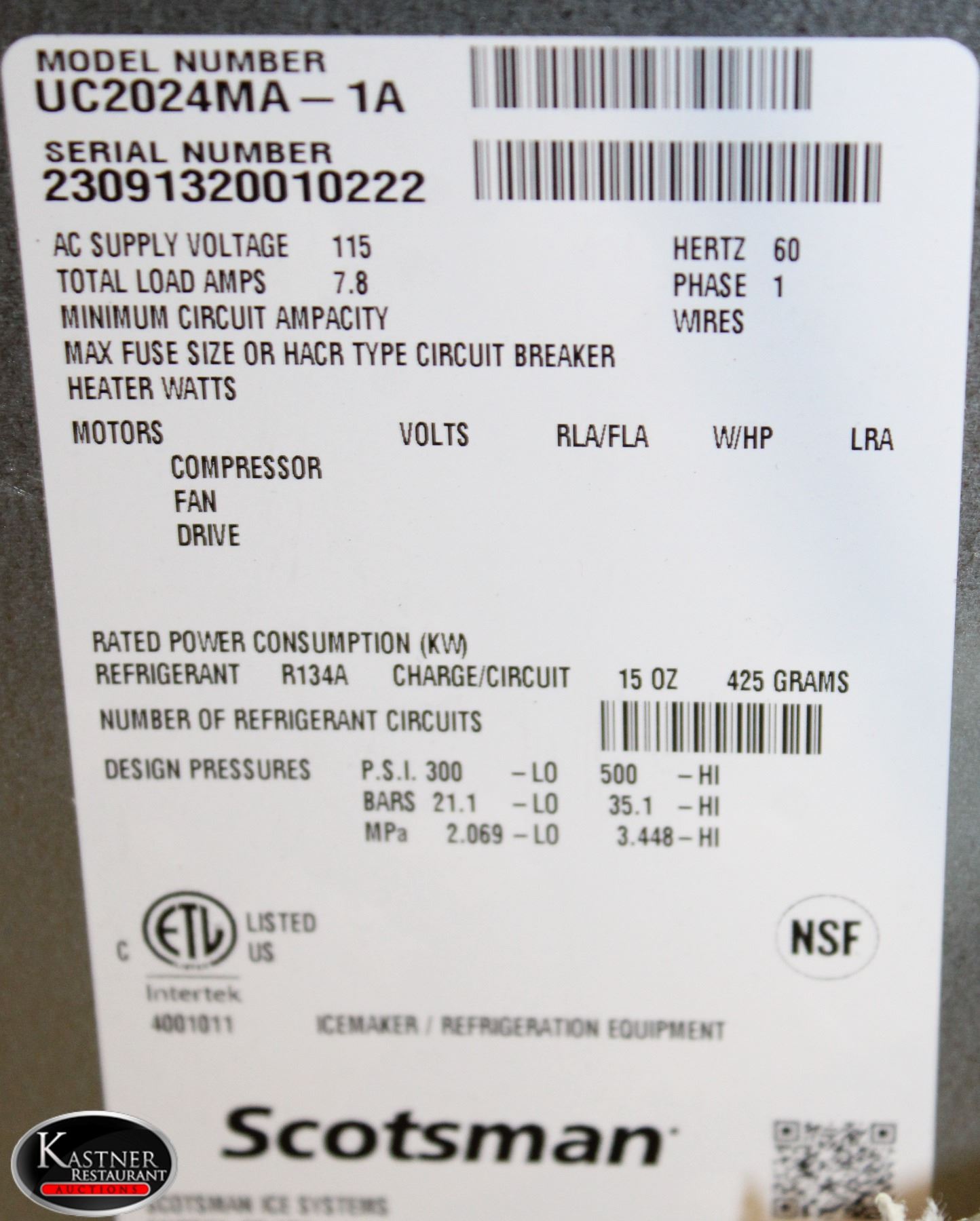 MODEL # UC2024MA-1A, 112 VAC, 7.8 AMPS, 60 HZ, PHASE 1
