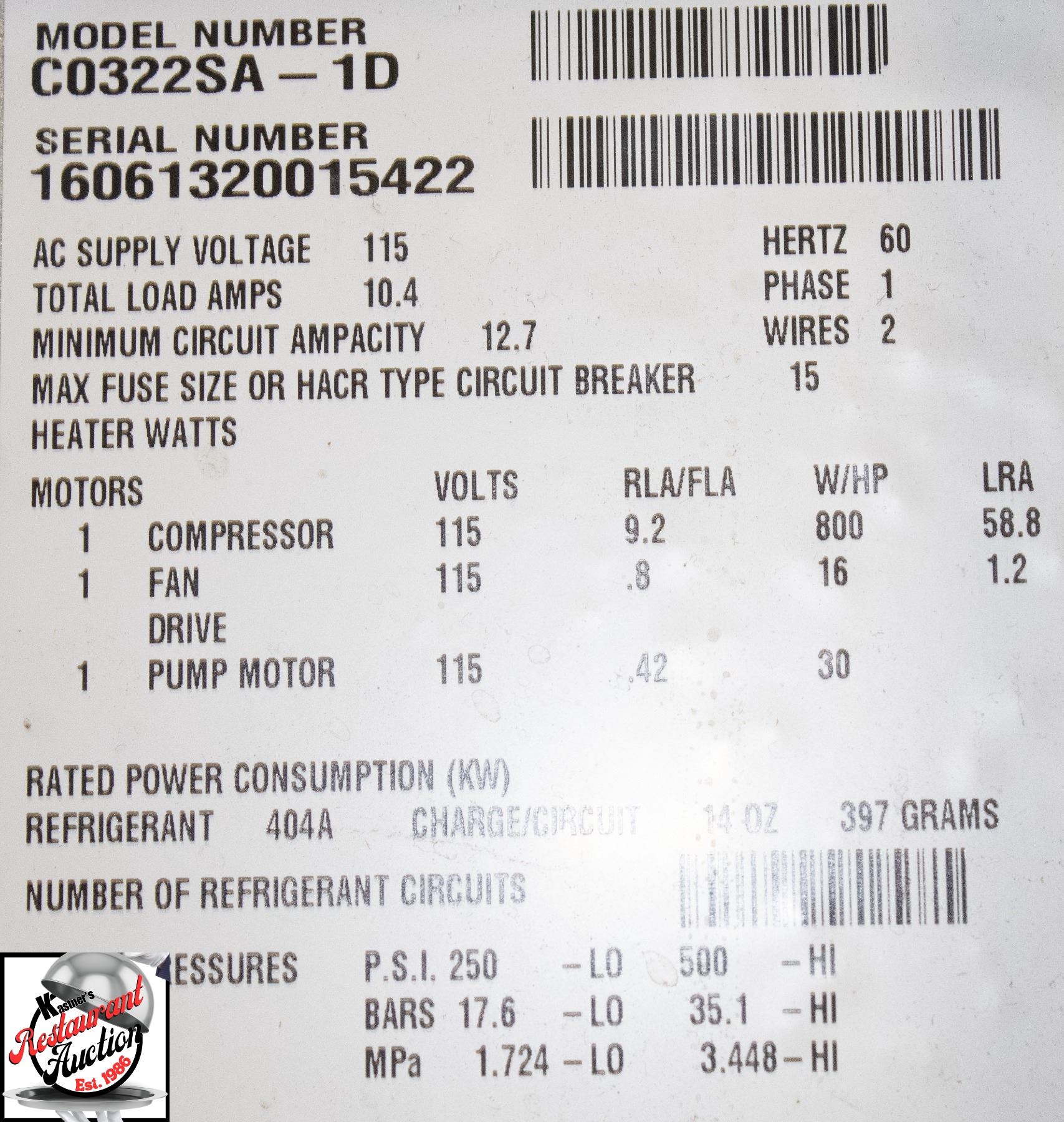 MODEL # CO322SA-1D, 115 VOLTS, 60 HZ, 10.4 AMPS, PHASE 1, 2 WIRES, 22" X 33" X 75"