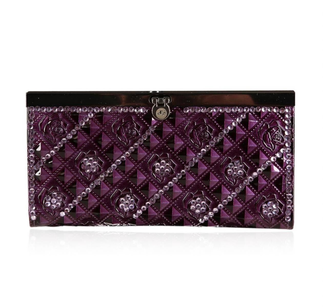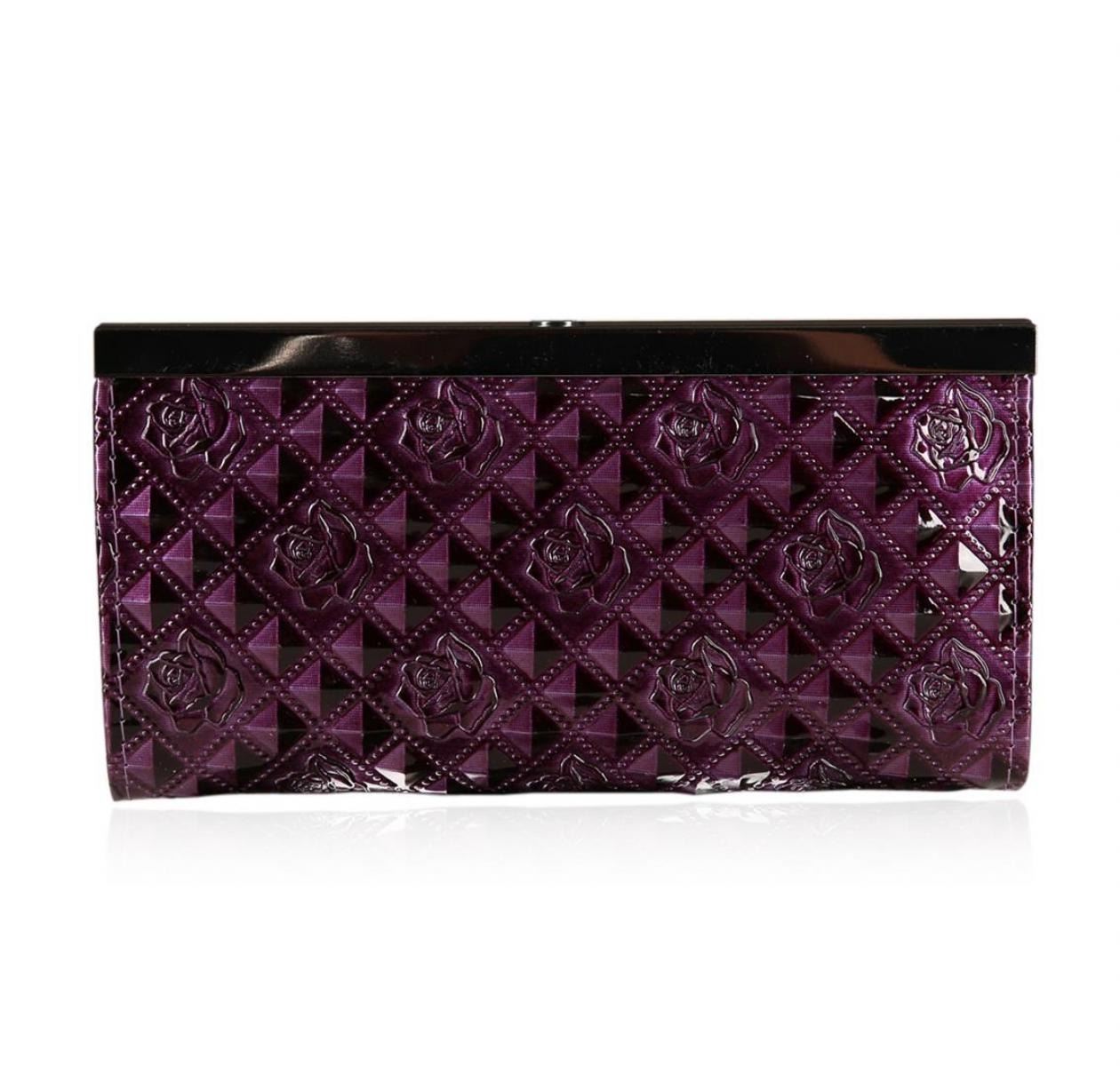 A SCP Wallet embellished with stones. Purple Patent. Embossed with Roses.