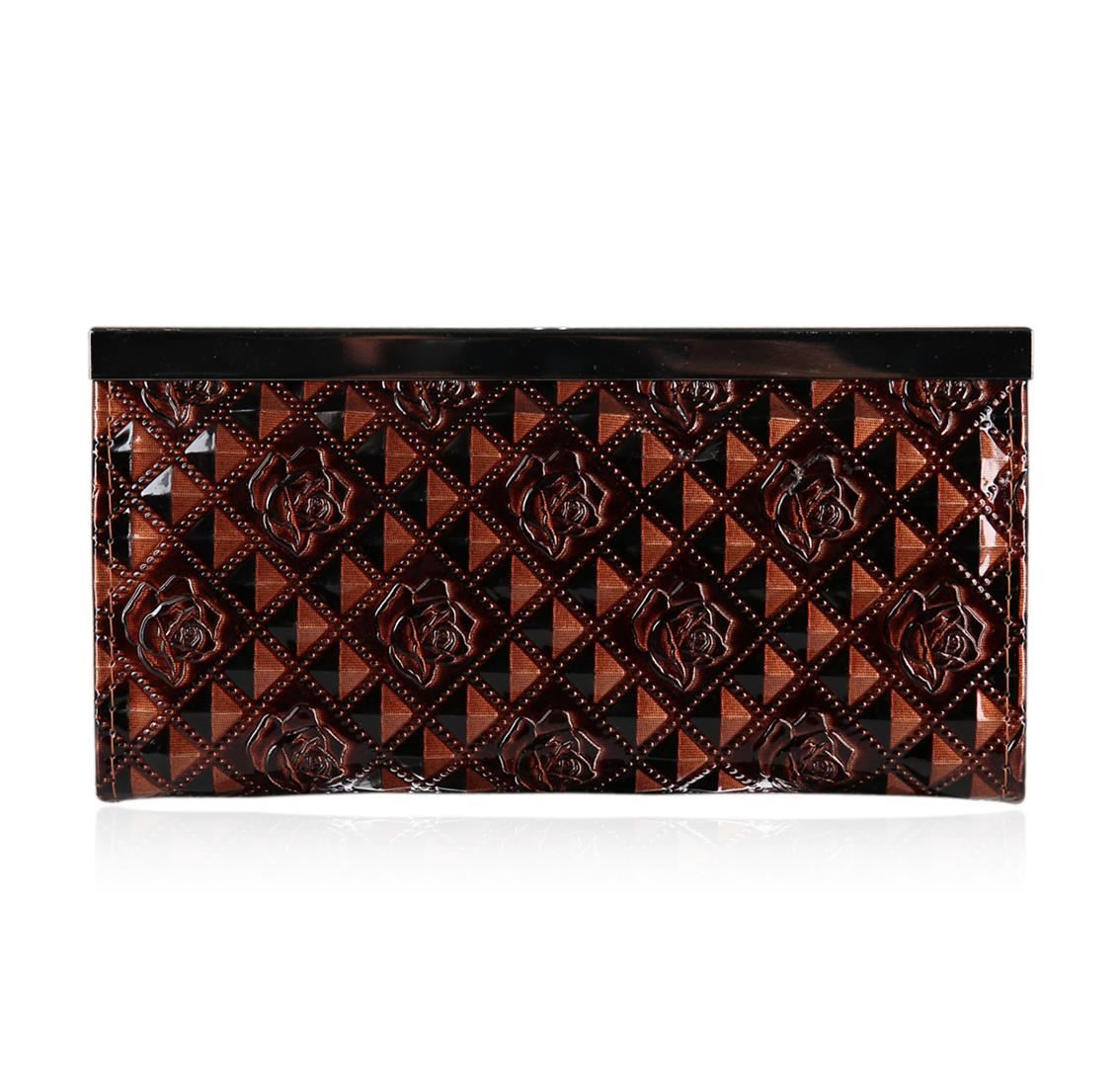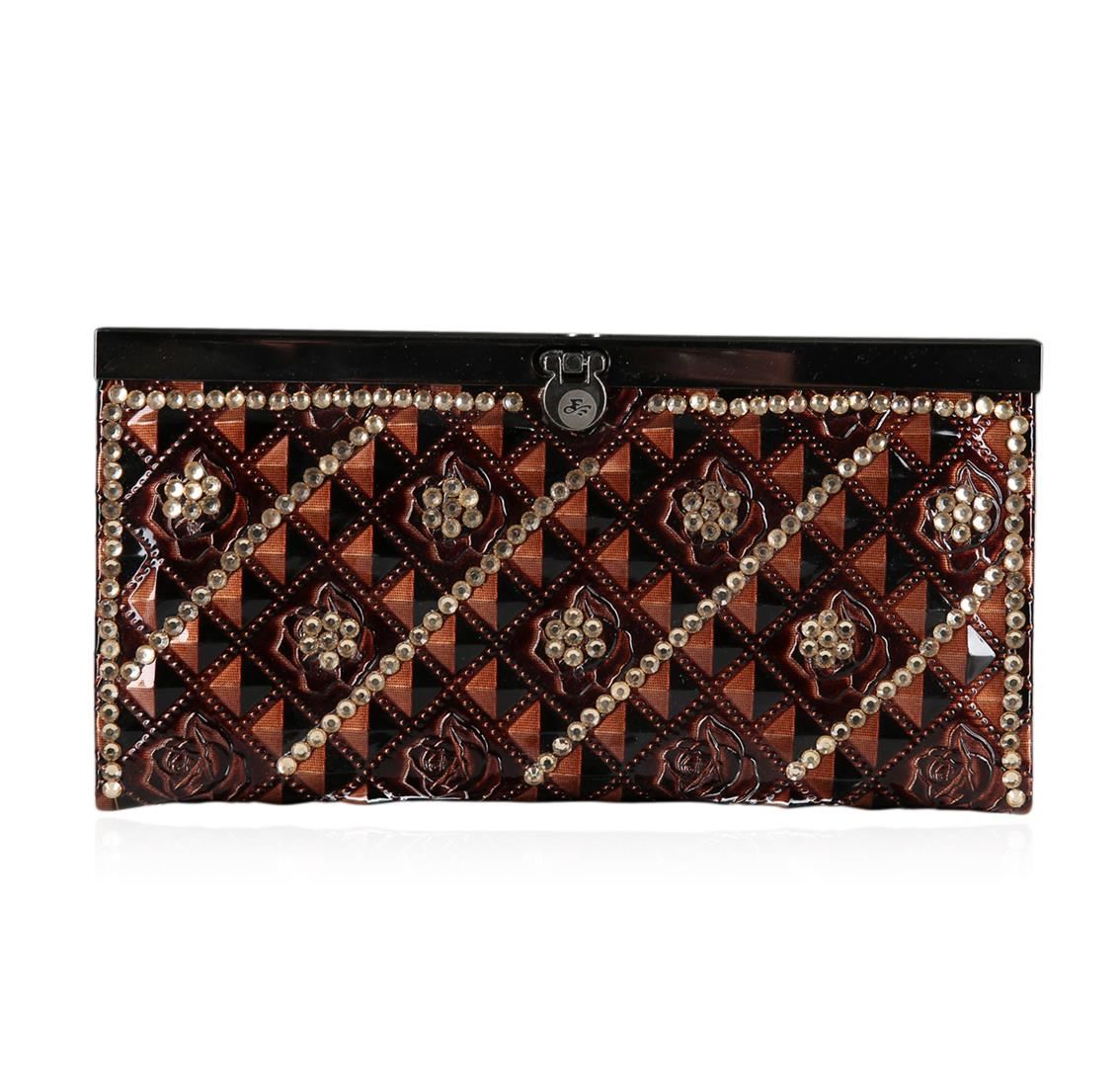 A SCP Wallet embellished with stones. Brown Patent. Embossed with Roses