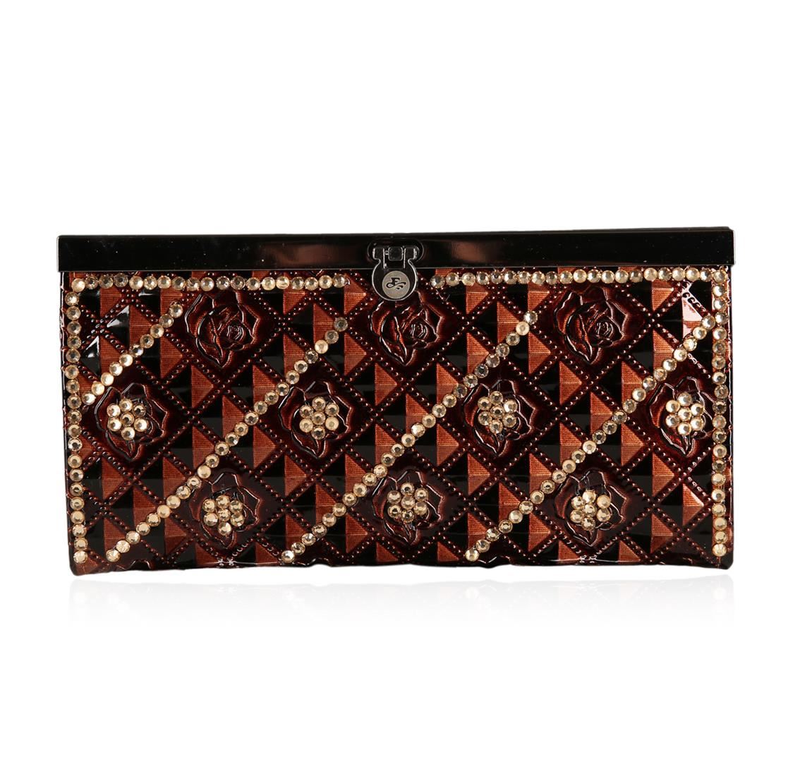 A SCP Wallet embellished with stones and roses embossed. Brown Patent