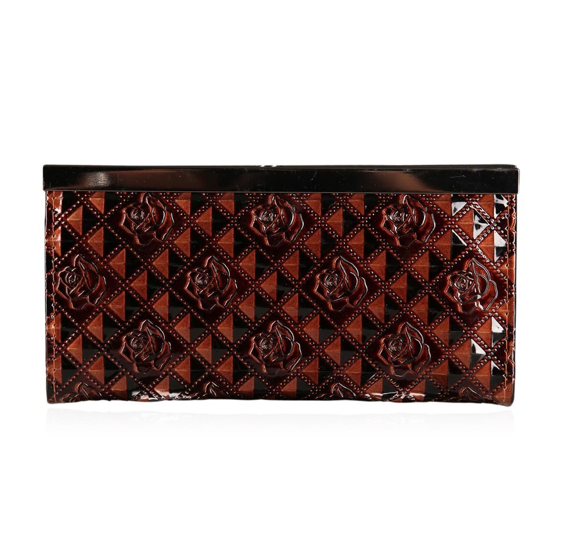 A SCP Wallet embellished with stones and roses embossed. Brown Patent