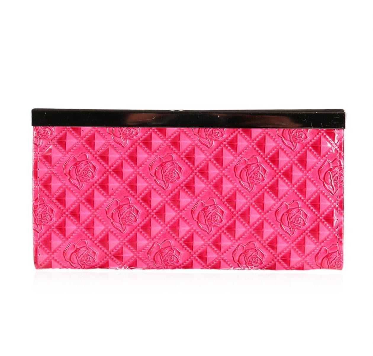 A SCP Wallet embellished with stones. Pink Patent. Embossed with Roses.