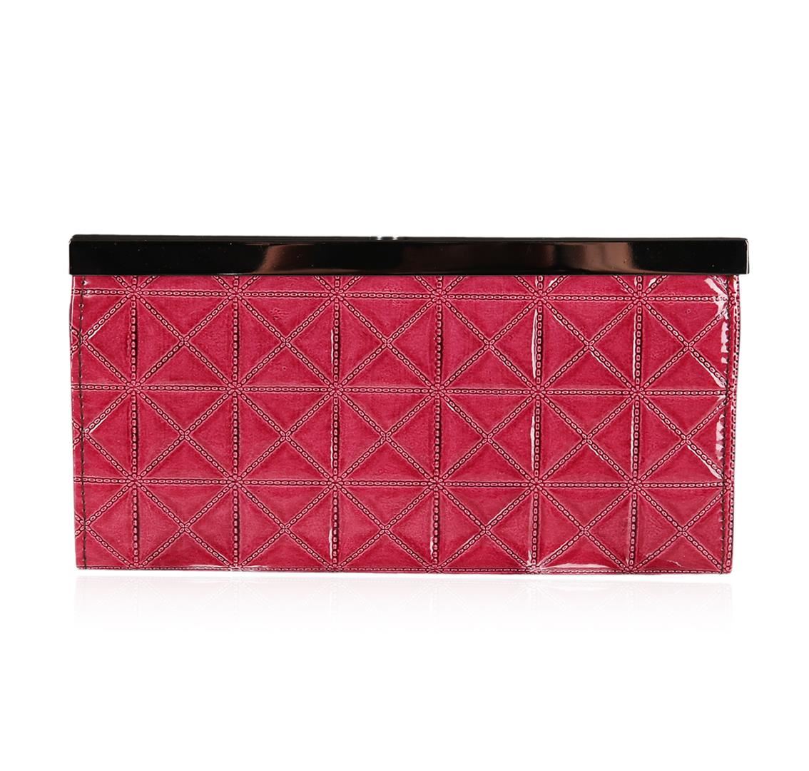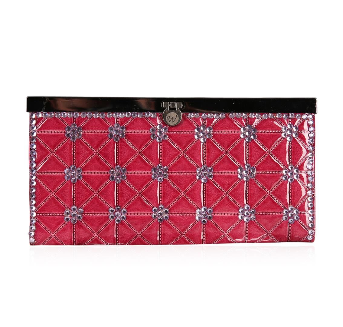 A SCP Wallet embellished with stones and embossed with detailed design. Dark Pink Patent.