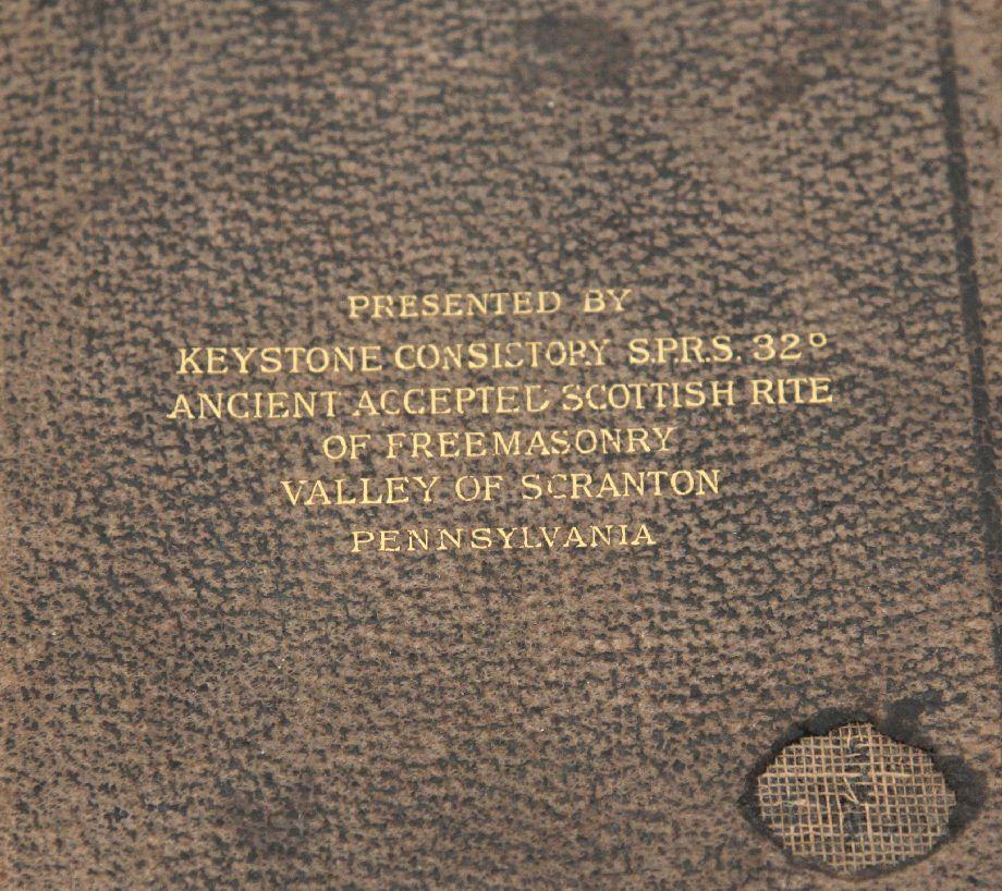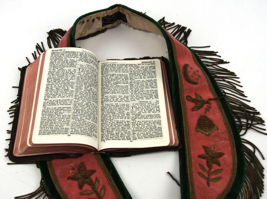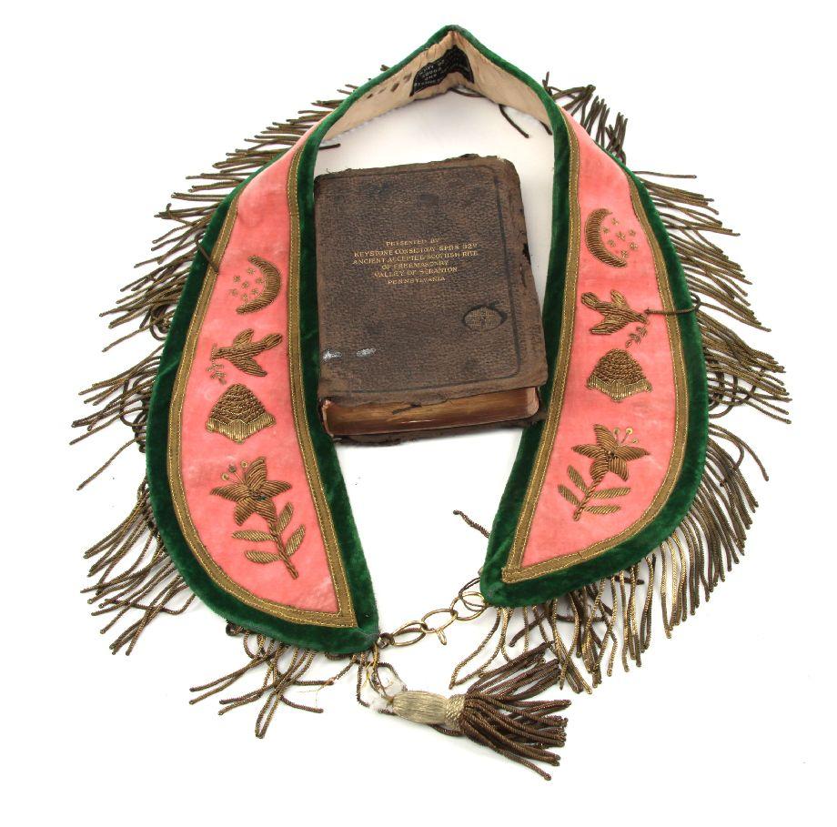 A early Masonic bible Valley of Scranton Pa. and a equally early Eastern Star sash, bible cover is somewhat worn , sash is very good with bullion thread intact.