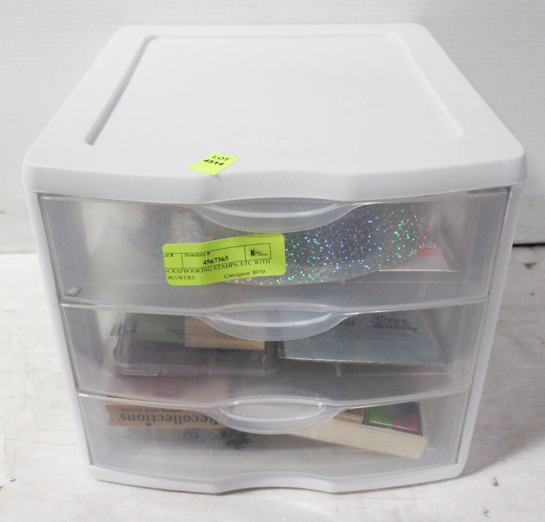 SCRAPBOOKING STAMPS, ETC WITH DRAWERS