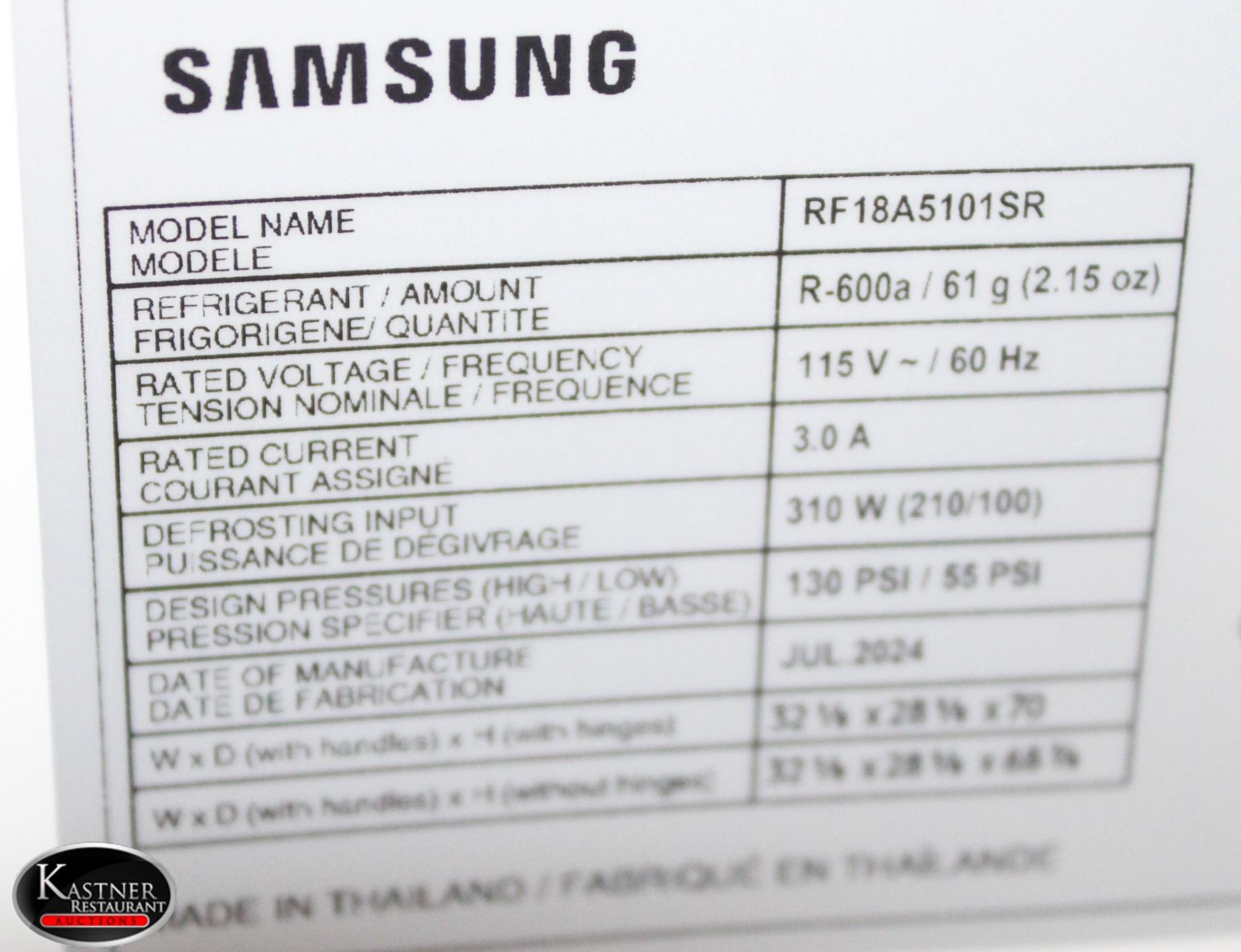 MODEL # RF18A5101SR/AA, 115 VOLTS, 60 HZ, 3.0 AMPS, 310 WATTS 130 PSI, 28" X 32" X 70"