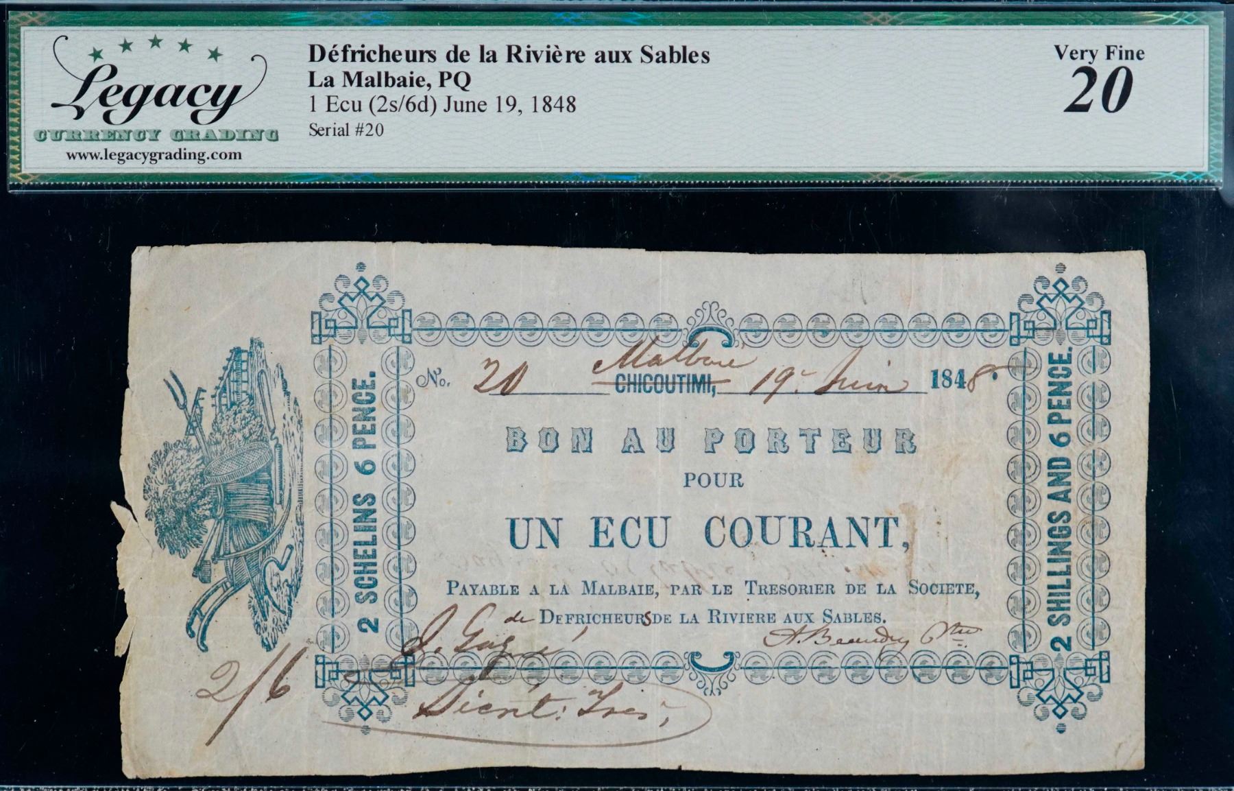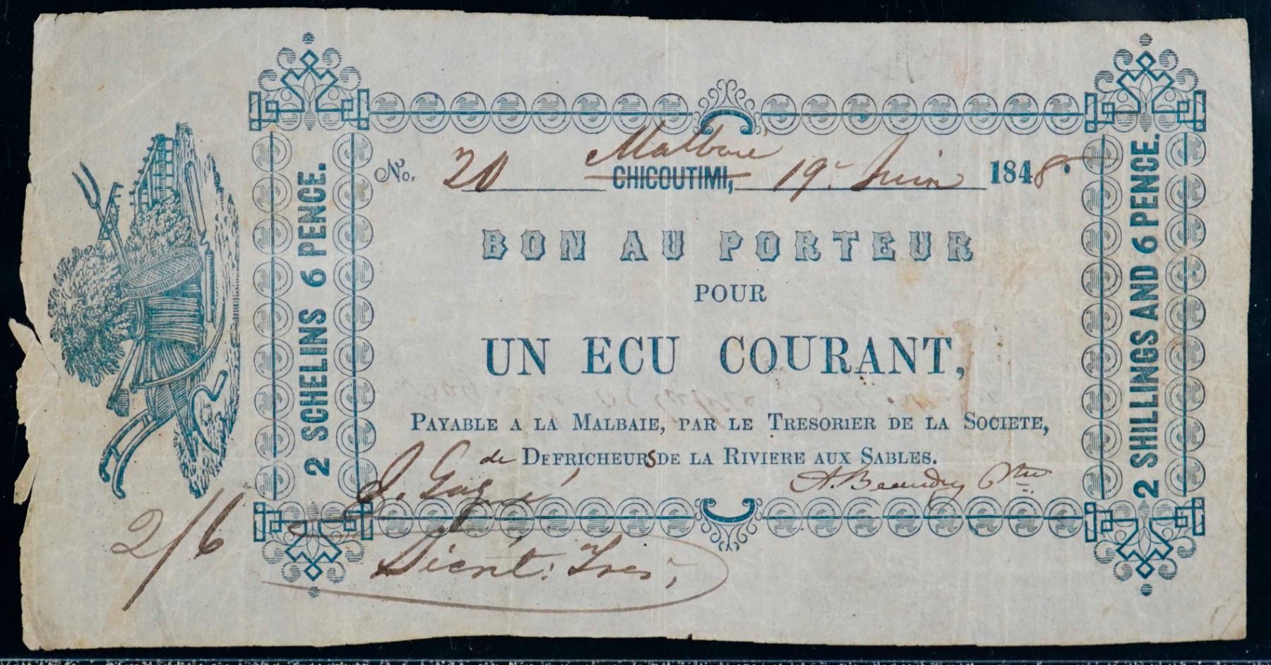 SCRIP; "Défricheurs de la Rivière aux sables" MALBAIE/CHICOUTIMI 1848 1 Ecu (2 SHILLINGS & 6 PENCE) #20 LCG Very Fine-20, small edge tear.