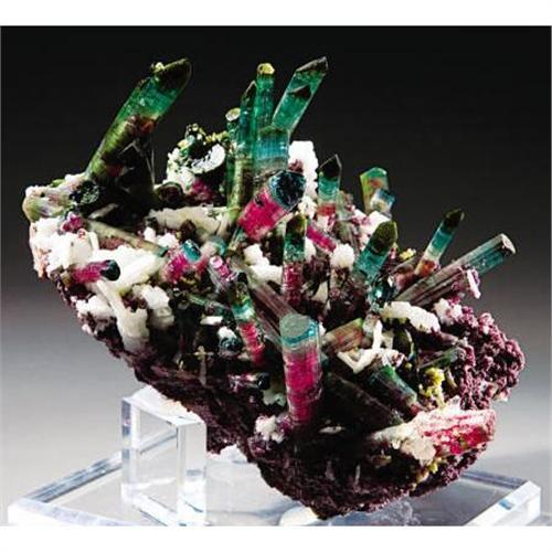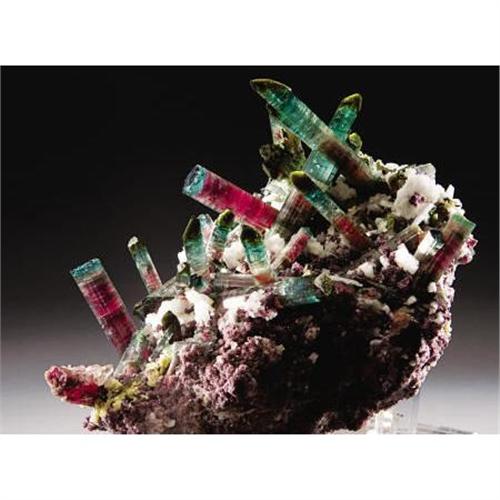 <B>SCULPTURAL GEM TOURMALINE CLUSTER - COLOR STUDY IN PINKS, BLUES & GREENS</B></I><BR> <I>Pederneira Mine, Lavra da Pederneira, São José da Safira, Minas Gerais, Southeast Region, Brazil</B></I><BR>Deep in the bowels of the earth, Nature had marshaled all of the elements necessary to create this truly aesthetic gem mineral specimen. This fine sculpture is a reminder of Nature's ability to create beauty out of base chemicals. The gem tourmalines have intensely rich cranberry red cores that are overcoated with shades of blue green, giving the exterior of the crystal a lilac cast. The crystal terminations are rich green to bright blue-green in color and are primarily pinacoidal; even those crystals which appear to have flat terminations, up close, reveal that there are actually numerous alternating small, flattened, pyramidal terminations. The numerous gem tourmalines erupt from a matrix of lavender lepidolite and white albite. A sizable specimen, this sculptural bi-color tourmaline cluster measures 9 ½ x 8 ½ x 6 inches.<BR><BR><b>Shipping:</b> Requires 3rd Party Shipping (<a target="_blank" href="http://www.heritageauctions.com/common/shipping.php">view shipping information</a>)