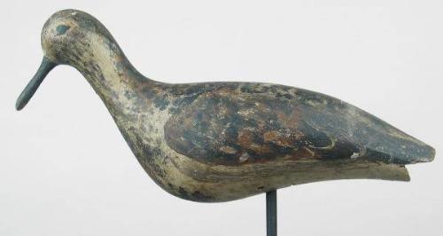 SCULPTURAL split tail plover decoy ca 1890-1900 in OP from MV or Nantucket, MA with painted eyes. In emerging Spring plumage with feather detail and light wear. Bill may or may not be original. Two small holes in the bottom remain near the stick hole where two wire legs were used to mount it. A shallow short line is also cut crossways just below the stickhole. (decoy)