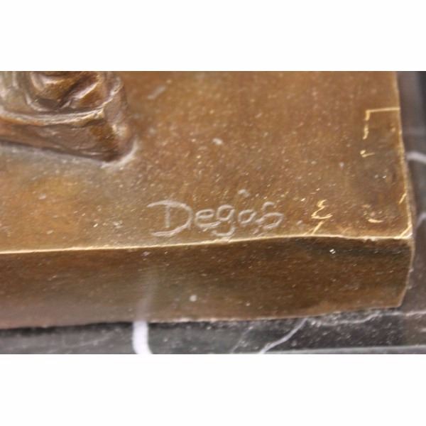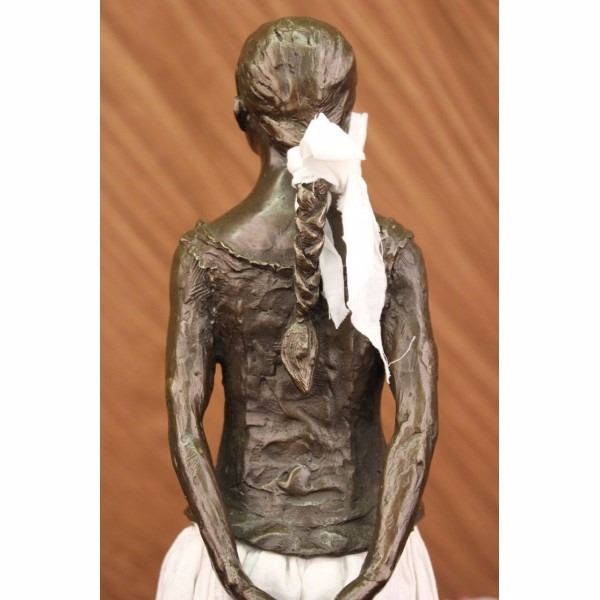 A unique piece of a young dancer. A fluffy white tutu is attached to this handmade bronze sculpture adding an extra dose of realism to the piece. She holds her arms delicately behind her back as she gazes wistfully into the air. On the back of her head is a cloth that matches the material of her skirt. The French artist Edgar Degas, known as a father of Impressionism, is famous for his artwork depicting ballerinas. This work of art is signed Degas. It stands on a black marble base. The popular lost wax method was used to craft this beautiful sculpture. Condition: This sculpture is in perfect condition. Bronze Dimensions with Marble Base:Height 18" x Width 6" Marble Dimensions:6" X 5 1/2" Height without base: 17" Weight :14 LBS Inventory : 17-X0225971