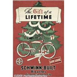 <B>Schwinn Bicycles (Circa 1950)</B></I> Advertising Poster (14" X 21"). Bicycles and Christmas were a classic combination and there was no need to sell the concept, only the brand. With cross over appeal to both bike and Christmas theme collectors, this point of sale poster, sent to bicycle shops, has all the bells and lights. Rolled, Fine condition.