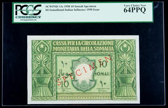 SCWPM# 13s 1950 10 Somali Specimen. PCGS Very Choice New 64PPQ. . Fr-13s. A lovely specimen that catalogs for $750 in Uncirculated in the most recent Krause SCWPM (Standard Catalog of World Paper Money).