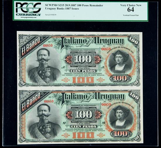 SCWPM# S215 20.9.1887 100 Pesos Remainders. Vertical Uncut Pair. PCGS Very Choice New 64. . Fr-S215. A vertical uncut pair of remainders.