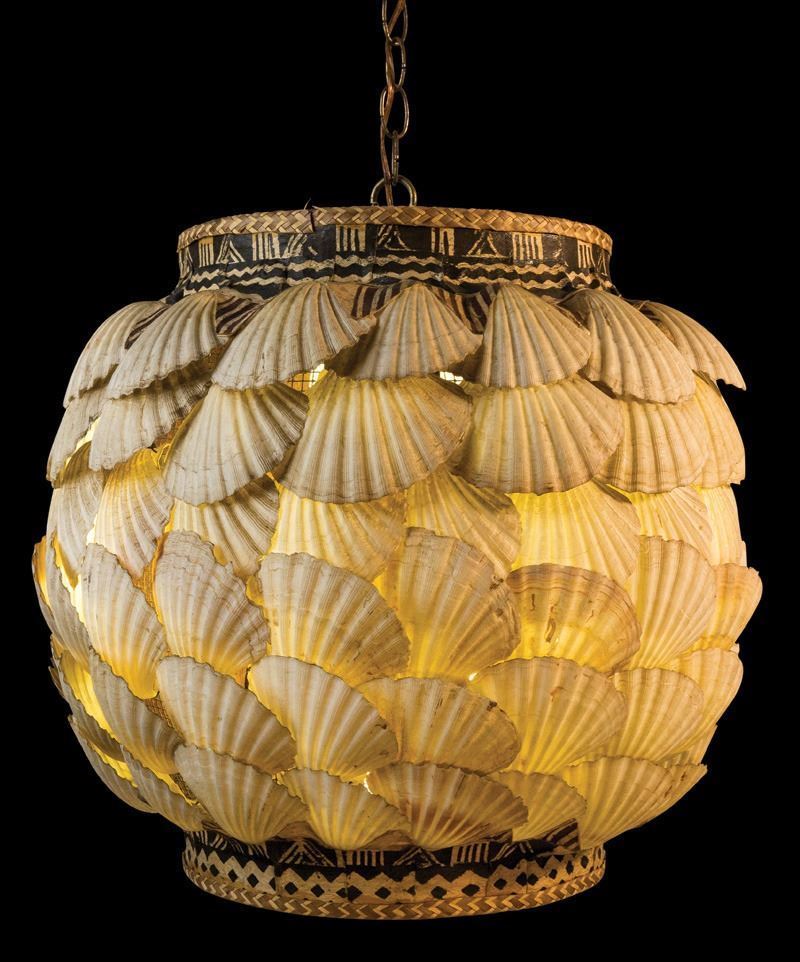 (1960s) A variation of the Sea & Jungle catalog scallop shell lamps. This one with an interesting opposing clamshell overlapping of the scallop shells. Purchased back by OA from Don the Beachcomber - Las Vegas location upon its closure.18"x19"VG+ with typical wear