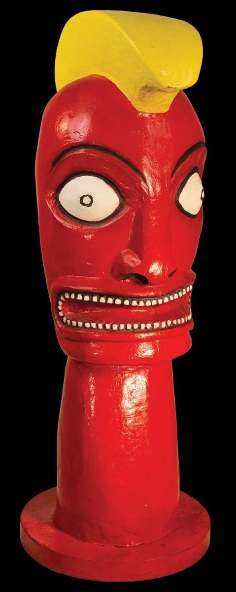 (1960s) A signature tiki from the studio rentals department. The inventory of Sea & Jungle was acquired by OA in the 1980s when they closed operations. Here is a famous fiberglass tiki used in many a Hollywood production. A bright Hawaiian War God with his Mahiole helmet headdress. On base.52"x14"x19"VG+ with typical wear