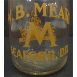 W.B. MEARS SEAFORD, DELAWARE MILK BOTTLE. 1 pint. Marked on front "W.B. Mears-Seaford, Del." with "M". Reverse of bottle is marked with seated boy and "Always insist on Good Milk". Top cap of bottle reads "Pure Fresh Milk".
