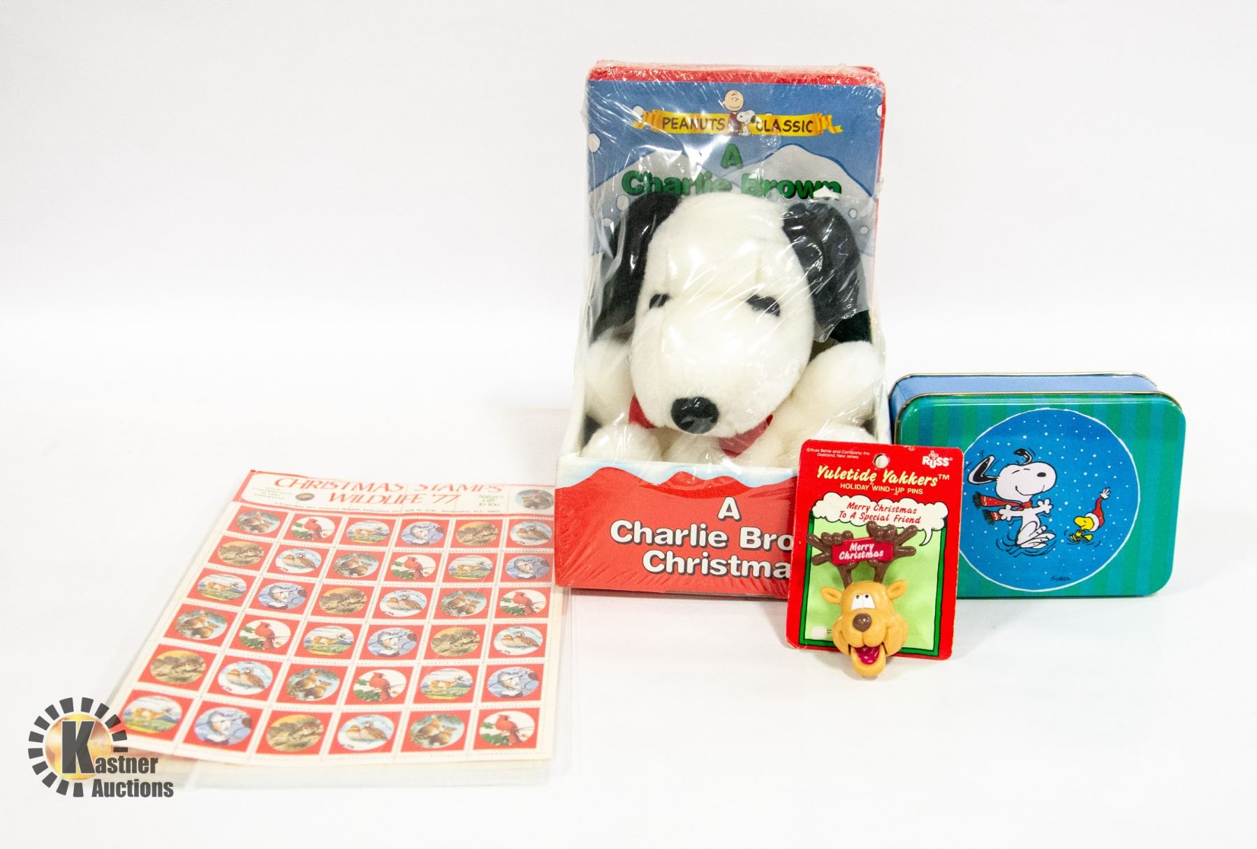A CHARLIE BROWN CHRISTMAS VHS & PLUSH SNOOPY W/CHRISTMAS 1977 WILDLIFE STAMPS 2 SHEETS (UNCUT) & MORE