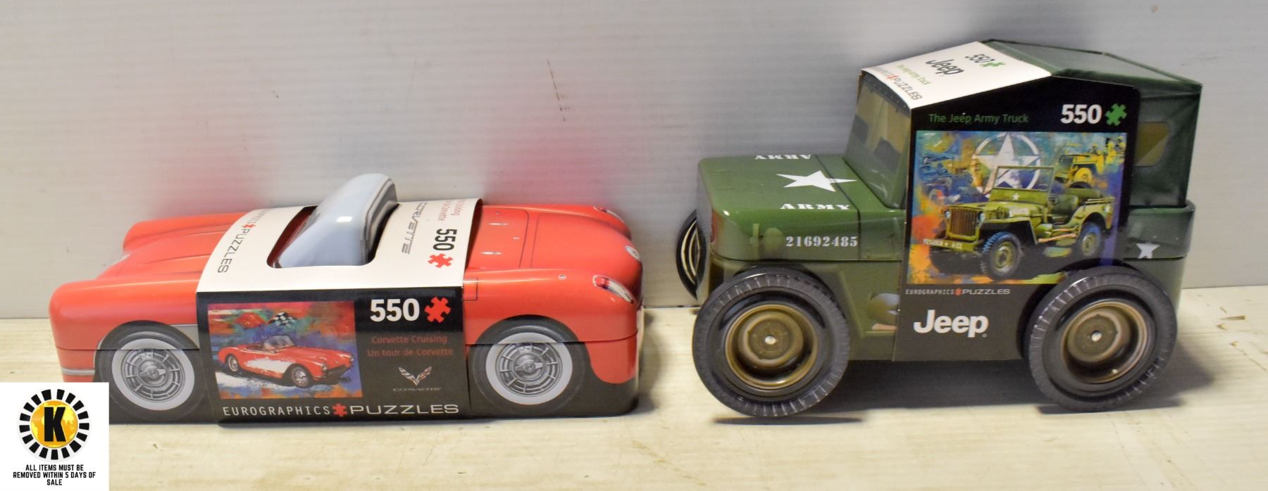 PUZZLE COLLECTIBLE TINS 550 PC PUZZLES CORVETTE CRUISING OFFICIAL LICENSED & WILLY'S JEEP